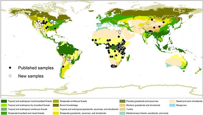 偶蹄目牙釉质样品的地理分布。样品数量=1366。