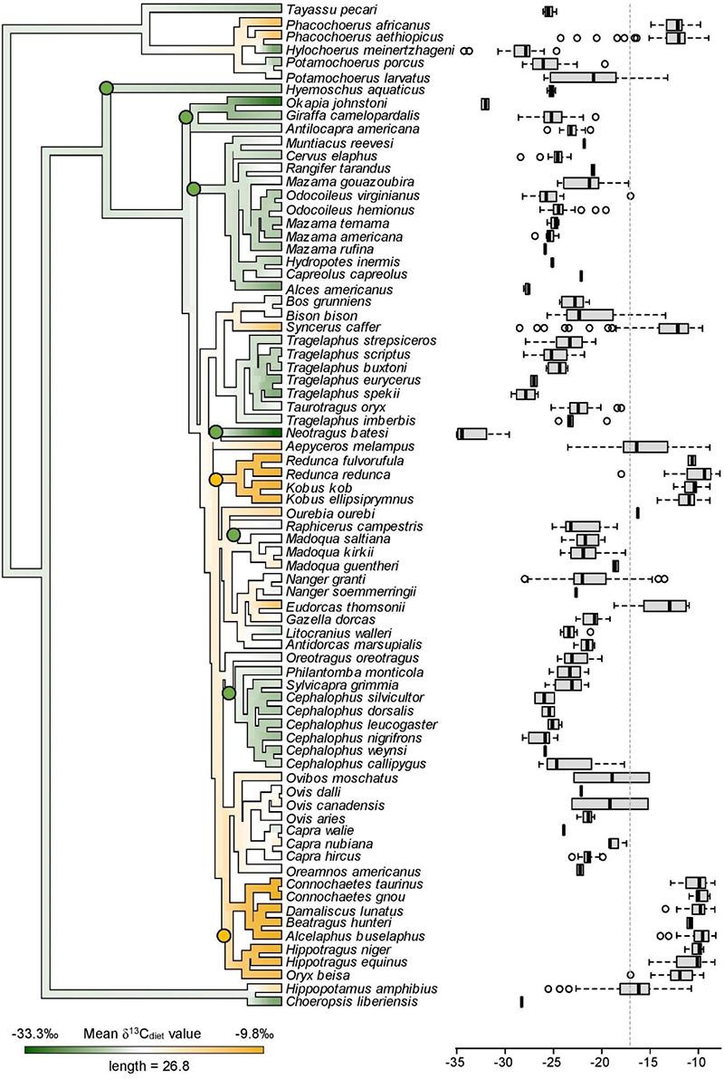 偶蹄目动物碳同位素数值在系统发育树上的分布(左)及箱型图(右)。物种数量=79。