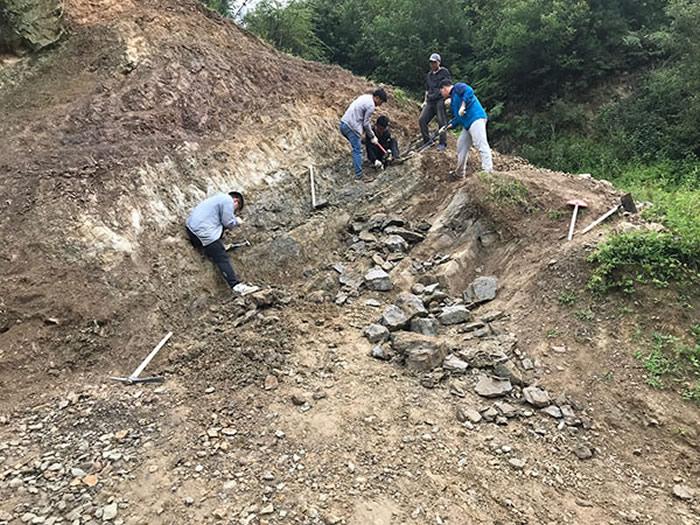 2018年,在朱敏院士牵头下,中国科学院古脊椎动物与古人类研究所与曲靖师范学院联合组建了自然历史文化研究中心,以加强对曲靖古鱼化石的挖掘与保护力度。 因此,在玉海翼角鱼的模式产地找到更多新的化石材料也提上了考察日程。在朱敏院士的回忆和带领下,野外团队终于找到了30年前位于曲靖市麒麟区徐家冲水库边上徐家冲组中含鱼化石的具体层位。 此后,盖志琨研究员带领曲靖自然历史文化研究中心的同学(图2),在该化石层开展长达2年的野外挖掘, 终于又在化石层又发现了大量早期脊椎动物化石。