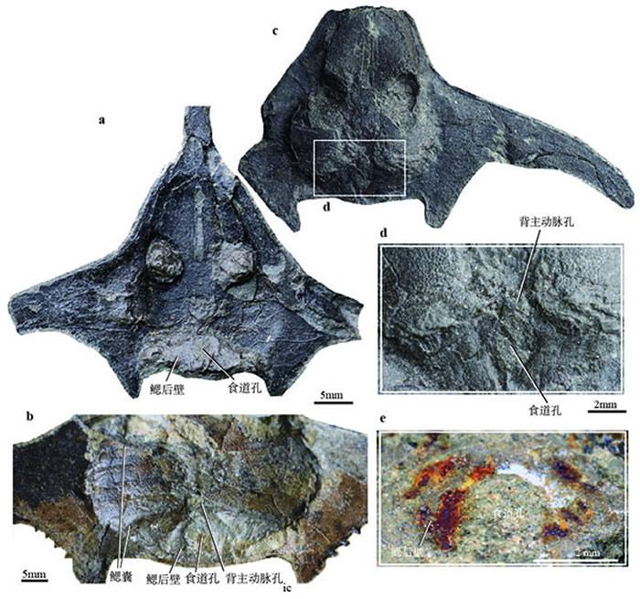 过去,由于保存和化石稀缺的局限,人们对盔甲鱼类腹面以及内部解剖特征知之甚少。而玉海翼角鱼新标本清楚的保存了腹面的关键形态学信息,是第一个明确揭示了食道和背主动脉位置关系的关键化石。在玉海翼角鱼的新标本中,鳃后壁中线上保留有两个开口,靠近腹侧的开口要比靠近背侧的开口大得多,因此前者更可能是食道的通道,而后者可能是背主动脉的通道(图6)。此前,在江西志留系真盔甲鱼类西坑裂吻鱼的鳃后壁上,也保存有一个开口,曾被认为是神经管的通道(图6e),但对曙鱼脑颅CT的三维重建表明,神经管应位于口鳃腔顶部的背侧,而该孔却靠近口鳃腔的腹侧,故不可能是神经管的通道,而应是食道的通道。早期鱼类的比较解剖学研究显示,盔甲鱼类的背主动脉跟有颌类是一样的,也是成对的,且沿着身体中线延伸,并没有明显的向右漂移现象,这可能代表了脊椎动物的祖先状态,因为在头索动物文昌鱼和无颌类盲鳗中也存在同样的情况。这就证明了七鳃鳗和骨甲鱼类主动脉的向右漂移现象的可能由居维叶管的不对称性造成的演化趋同现象。