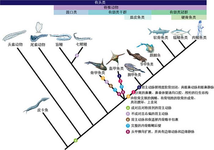 鱼类血液循环路线为单循环。从心室压出的缺氧血,经鳃部交换气体后,在身体背侧、脊柱下方汇合成背主动脉,将多氧血运送至身体各个器官组织中去; 离开器官组织的缺氧血最终返回至心脏的静脉窦内,然后再开始重复新一轮血液循环。背主动脉是脊椎动物出现的第一个有功能的胚胎内血管,在躯干中作为两条独立的双侧血管出现,并经历了从侧位到中线的横向易位,最终在中线融合成一条大血管。因此,背主动脉的演化是我们理解控制体内较大血管建立和重塑机制的一个非常理想的模型。但在在无颌类七鳃鳗幼体和一些骨甲鱼类中却存在一个比较奇特的现象,即它们的背主动脉不成对,而且不对称,即它并不完全沿着身体中线延伸,会在鳃区的后面有一个明显的向右漂移现象。目前,这一现象仅发现于七鳃鳗的幼体和骨甲鱼类中,曾经被作为支持现生七鳃鳗和骨甲鱼类亲缘关系密切的证据之一,即七鳃鳗是由骨甲鱼类外骨骼退化后演化而来的后裔。分支系统学的发展,越来越多的证据表明,七鳃鳗缺失外骨骼可能代表了脊椎动物的原始特征,也就说七鳃鳗是一种更原始的无颌鱼类;而骨甲鱼类则具有更多的有颌类的进步特征,比如成对胸鳍、骨细胞、上歪尾等, 是与有颌类亲缘关系最近的姊妹群。 因此, 七鳃鳗和骨甲鱼类背主动脉向右漂移的不对称现像,可能是平行演化的结果!这种情况下,系统位置位于七鳃鳗和骨甲鱼类之间的中国盔甲鱼类到底是什么情况就显得非常重要了!