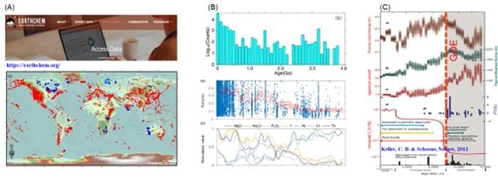 (A)Earthchem全球火成岩数据库;(B)铁镁质火成岩地球化学成分(元素含量)演化时间序列;(C)铁镁质火成岩地球化学成分突变(~2.5Ga)与大氧化事件(GOE)耦合。