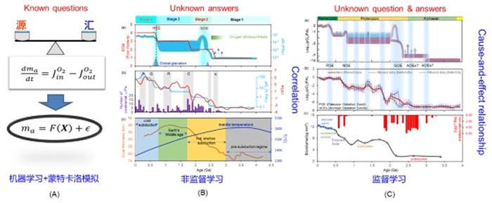 (A)构建深时氧气预测的蒙特卡洛模拟与机器学习方法;(B)非监督机器学习挖掘全球铁镁质火成岩成分大数据的分阶段演化模式,发现其与大气氧化历史的相关关系;(C)利用火成岩大数据与机器学习定量模拟预测大气氧气含量,揭示大气氧化成因机制。