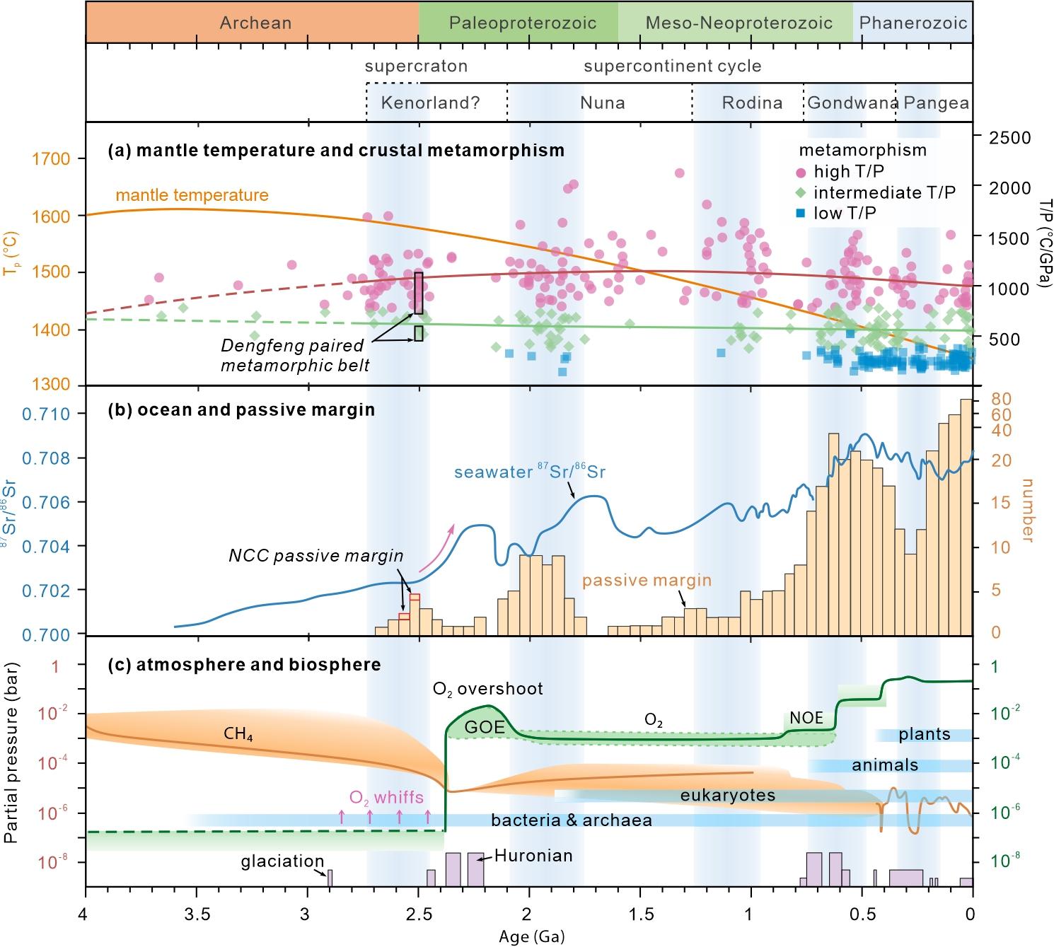 研究人员提出一个概念模型,阐述新太古代广泛发育的板块构造过程可能对太古宙—元古宙之交(25亿年前)及随后岩石圈、海洋、大气圈和生物圈演化产生的影响。以洋底扩张、洋壳俯冲和弧陆碰撞等为特征的离散和汇聚板块边界地质过程促进了这一时期地幔热散失、大陆地壳垂向和侧向生长、陆壳浮出水面、BIF成矿、弧陆碰撞造山作用、陆壳风化剥蚀和二氧化碳消耗、海洋营养输入和初级生产力增加、地球增氧(GOE)和第一次雪球地球形成等重大地质、成矿和环境演变过程。该模型为理解特殊地质历史时期的板块边界过程及其资源环境效应提供了新思路。