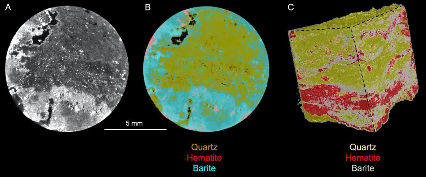 除了对三维叠层岩大结构进行实验室断层扫描外,研究小组还通过使用意大利的里雅斯特Elettra同步加速器的SYRMEP光束线,首次实现了亚微米级的像素和体素尺寸,对前寒武纪叠层岩的微观结构进行成像。这使得我们能够识别非均匀的层状结构、腐烂的有机物脱气产生的空隙以及被解释为微生物宫廷结构的柱状垂直结构,这是光合作用生长的常见指标。