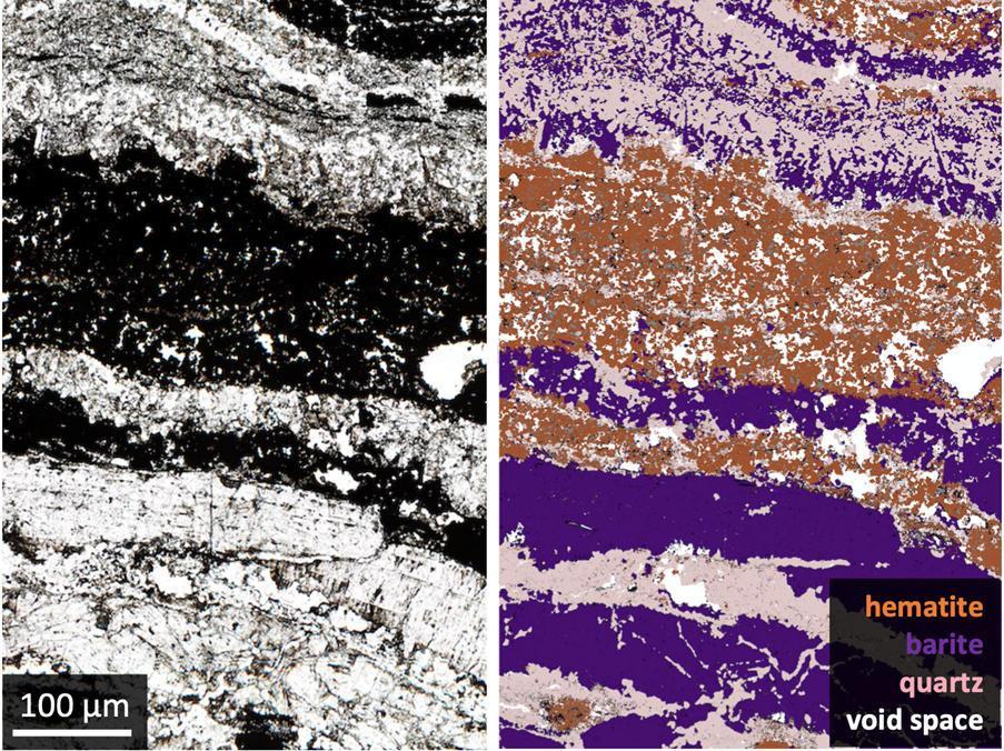 光学显微照片(左)和EDX图(右)显示了德雷斯珀地层叠层中的主要和替代矿物学。资料来源:Keyron Hickman-Lewis及其同事