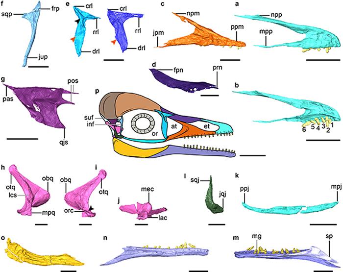 图2. 雅尾鹓鶵头骨面部骨骼的三维形态(王敏供图)