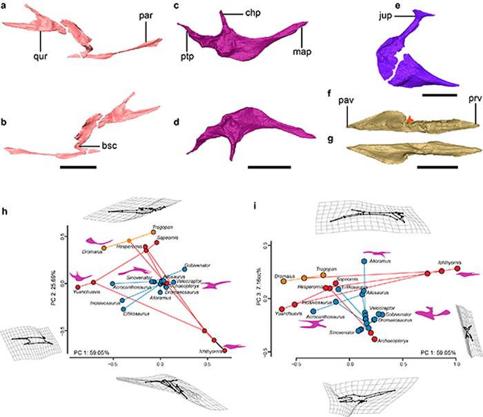 Yuanchuavis kompsosoura)的头骨进行三维复原,重建了几乎所有头骨骨骼的立体形态,包括构成头骨可动性通道的骨骼(图1–3)。研究结果显示鹓鶵保留了典型的主龙类双颞弓的颞区结构:三射型的眶后骨和颧骨、鳞骨分别相接,鳞骨又与方颧骨相接,从而形成了与眼眶完全分隔的上、下颞孔。这样的颞区构造限制了颧骨的前后移动,说明“侧面通道”并未形成。受保存的原因,中生代鸟类腭面骨骼的形态有可能是研究程度最低的。此次研究人员复原了该区域的主要骨骼,显示鹓鶵的翼骨和兽脚类恐龙相同,都具有宽大的方骨支,但缺失和方骨的可动关节,取而代之的是腭骨的方骨支与方骨的眼突形成嵌接式的关联。而腭骨显示出进步的特征,如缺失颧骨突,从而不再是兽脚类恐龙亦或始祖鸟那样的四射型。研究人员利用几何形态测量的方法追溯腭骨在恐龙—鸟类演化过程中的形态变化,提出颧骨突的缺失是鸟类腭骨形态“现代化”的第一步。鹓鶵的犁骨较为粗大而与恐龙相似,远不如现生多数鸟类那样纤细。鹓鶵保留了宽大的外翼骨,与颧骨相接。上述的腭面构造与兽脚类恐龙相差无几,说明腭面通道也未出现(图4)。而相较于颞区和腭区的构造,鹓鶵的其他头骨形态都呈现出典型的、进步的鸟类特征,说明头骨不同部位的演化速度是非均一的,颞区和腭区在演化上相对保守,这样原始和进步的形态特征同时出现,就是典型的镶嵌演化。如果再与鹓鶵已经非常进步的头后骨骼形态相比,这样的差异就更为显著。