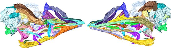 研究中,团队利用高精度CT对此前他们发现的中生代反鸟类雅尾鹓鶵的头骨进行三维复原,重建了几乎所有头骨骨骼的立体形态,包括构成头骨可动性通道的骨骼。