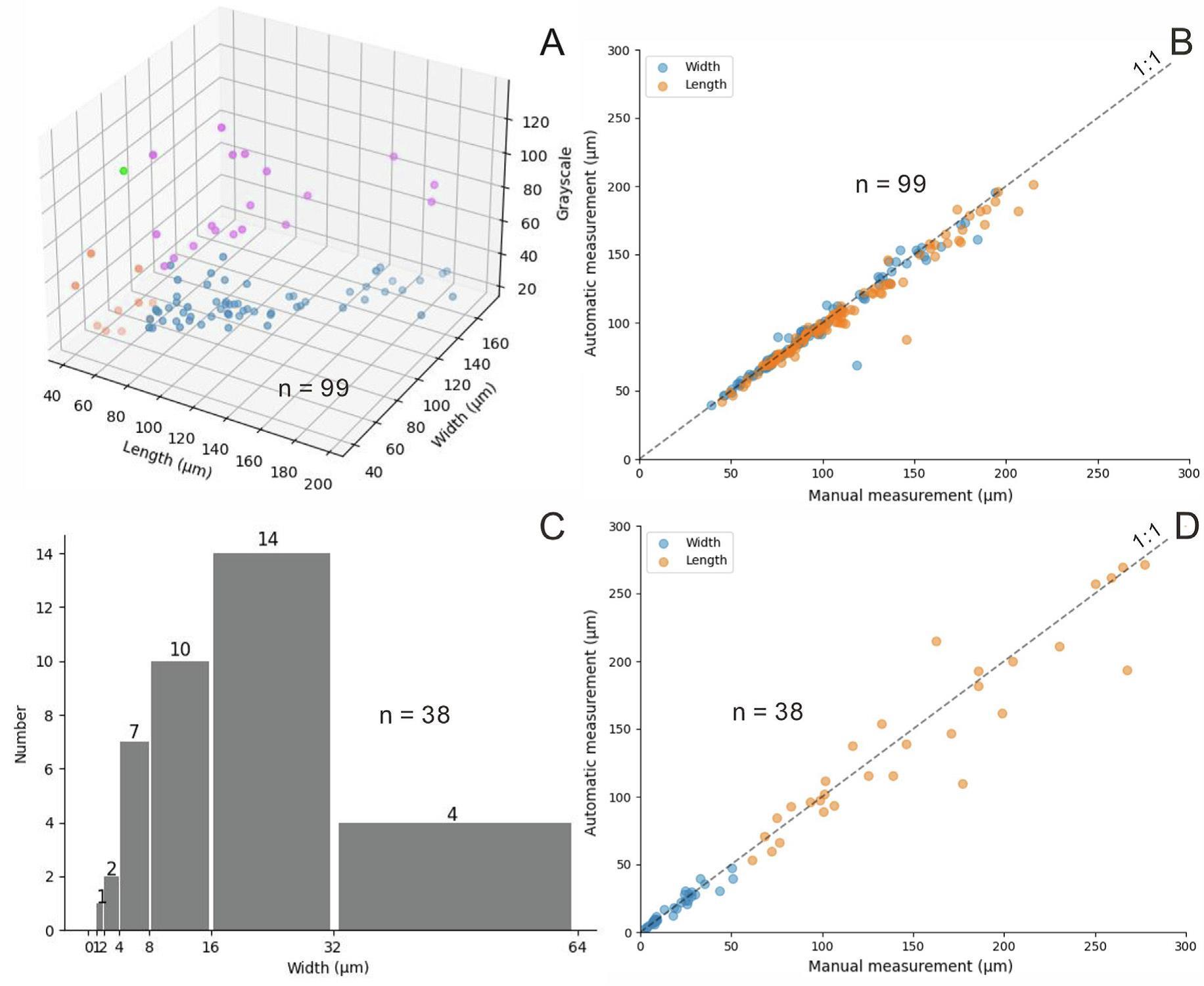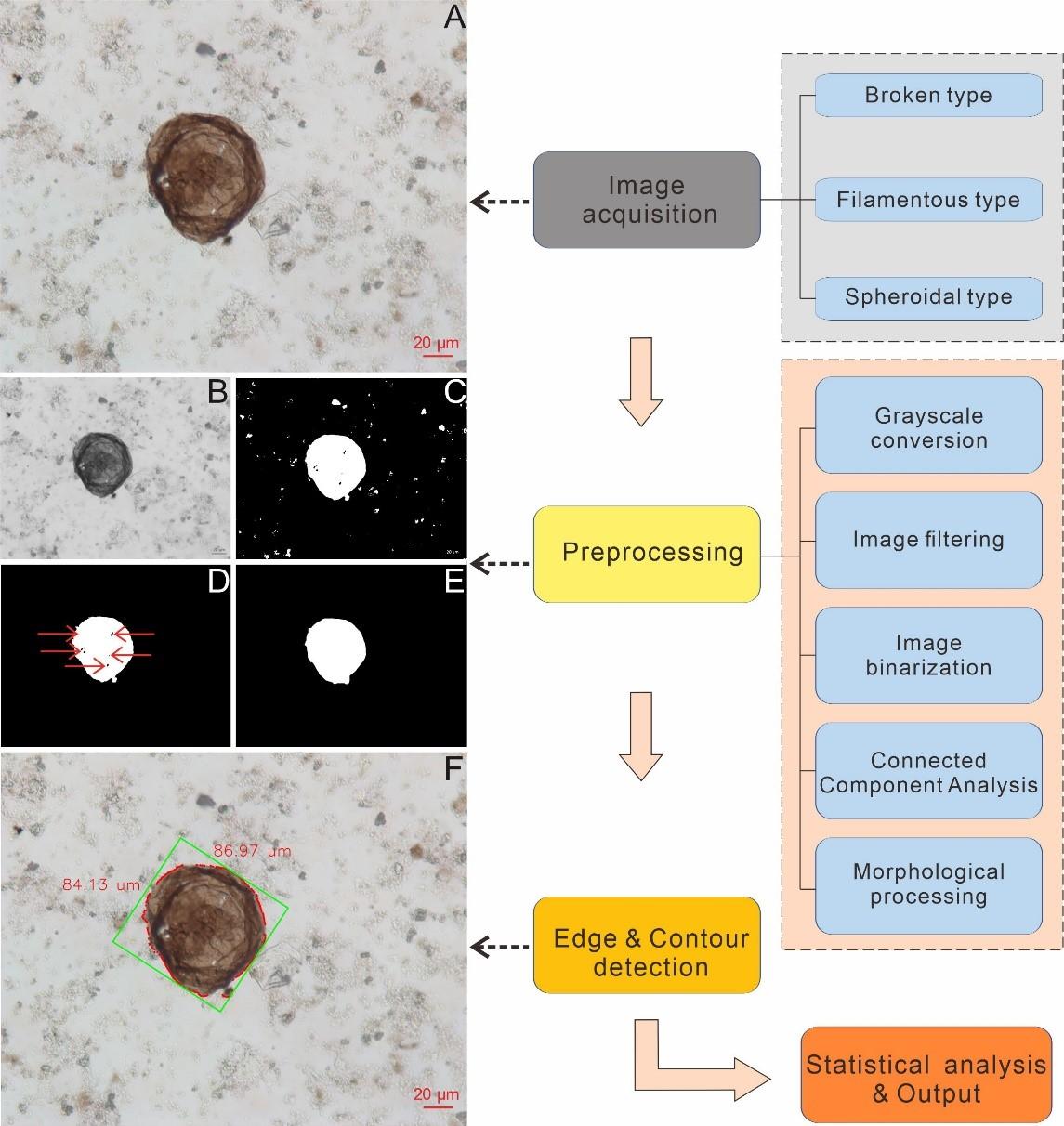 该软件版本主要是基于OpenCV-Python快速图像处理的计算机视觉工具,使用了多种图像处理技术,包括灰度转换、图像滤波、图像二值化、连通域分析等,并采用了OCR字符识别技术对化石图像比例尺进行自动识别以及换算,实现了对椭球形、丝状体、部分破损等类型的有机壁微体化石形态特征进行自动化批量提取和定量分析。分析结果可以Excel数据(.xlsx格式)导出或以箱线图、散点图、直方图、聚类图等多种类型图件呈现。