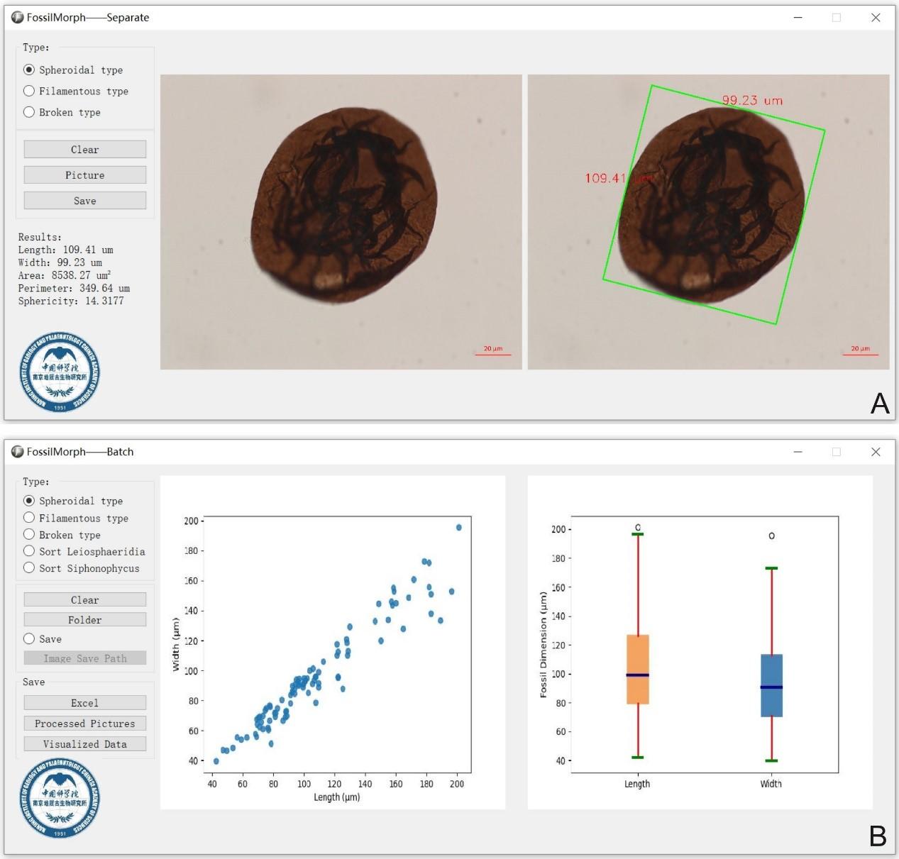 FossilMorph单图处理模式(A)和批量处理模式(B)界面截图