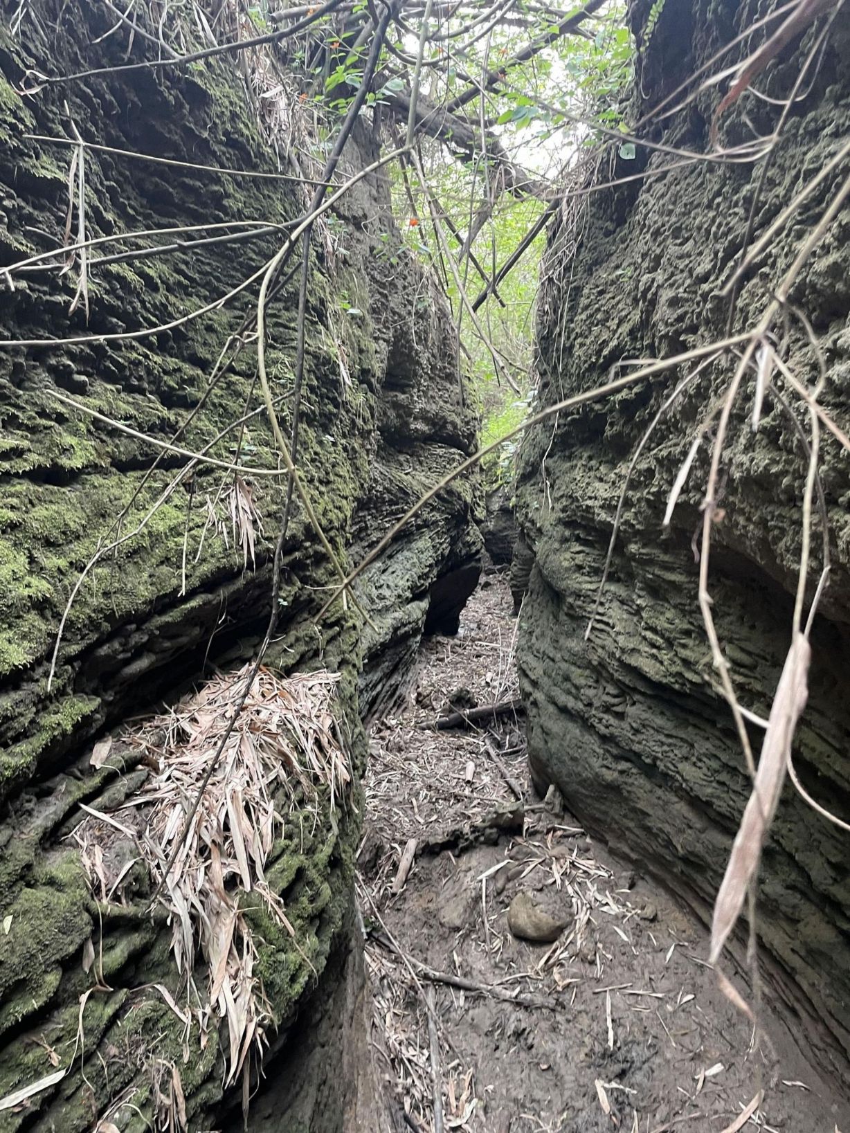 属于恒春西台地的这座峡谷隐藏在低海拔山区的次生林里面,一开始团队还必须在森林中挥刀开路,而随着地势深入河沟,环境也从一开始的茂密次生林,逐渐变成陡峭险峻的一线天地形。夹道的月桃、飞机草和五节芒,更不知在何时转变成质地细碎、松软却又锋利的泥岩山壁,有一层层的明显纹理,岩壁上和地上散落着或细碎或完整的贝壳化石,而指甲大小的小雨蛙、横行的泽蟹和攀木蜥蜴在看到我们时迅速逃开。峡谷阴沉无声,我们走进的是历史的沉积,岩壁上那一层又一层的细碎岩粒、还有一节节的管状生痕化石,是曾在海底的几万年岁月。