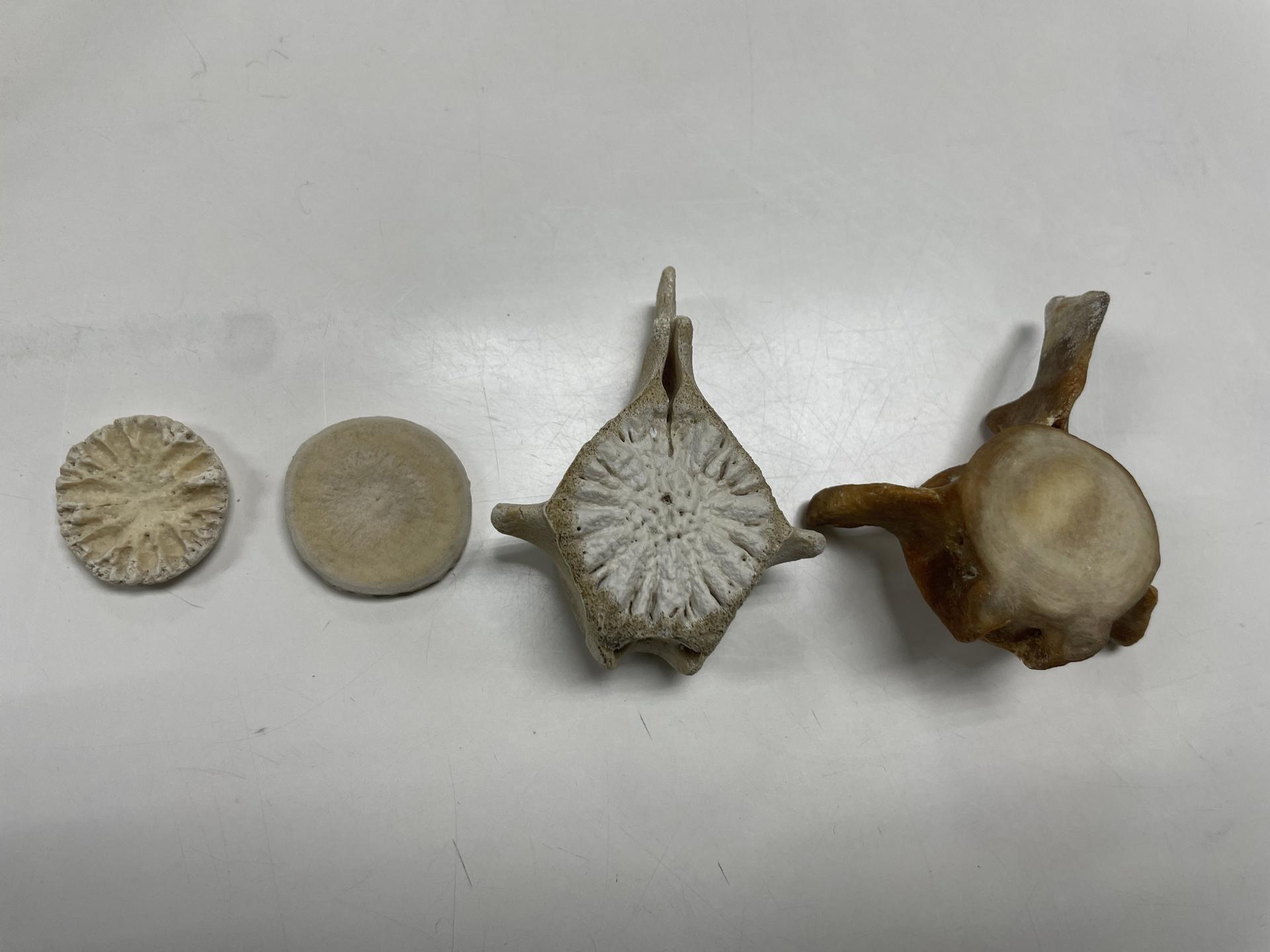 生长板有没有愈合,是判断一只鲸鱼成熟与否的重要依据。左一、二为幼年中华白海豚的生长板,左三为生长板尚未愈合的脊椎骨,最右是成年港湾鼠海豚的脊椎骨,生长板已经愈合,黏在一起。摄影:钟慧元
