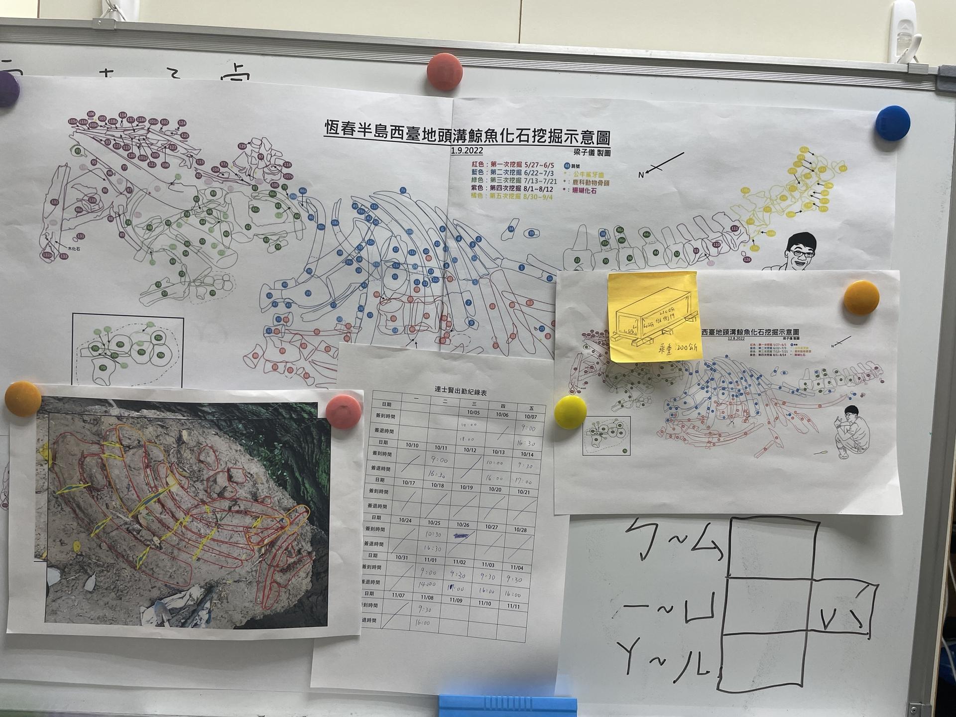 过去虽有民间化石搜藏家在其他地方挖到鲸鱼化石,但那经过了冲刷位移,并不是原地层所产,且没有留下详细纪录,「没有详细纪录的话,地层信息就没有了,」Jerry说。而每天晚上结束挖掘工作、回到民宿之后,Jerry会绘制采集图,仔细记录每一块骨头的相对位置与编号,方便之后回去对照,「因为你隔天就忘记了,这是发掘化石的必要工作,没有这个图的话,等通通搬回科博馆可能就不知道哪块是哪块,必须要靠这个图找回所有的信息。」杨子睿说。