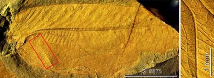 2.4亿年前蝈蝈的鸣器:音齿(红框内部分)及其局部放大图(右)。(中科院南古所供图)