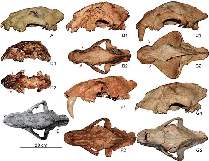 Amphimachairodus F-G头骨化石对比。箭头指示猎剑虎属强烈的犬齿后吻部收缩。