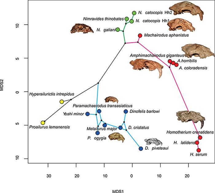 Nimravides catocopis在时代上也是连续的(late Clarendonian, ~1000万年),因此科研人员认为美国学者Larry Martin的观点更可能是对的,即北美的猎剑虎