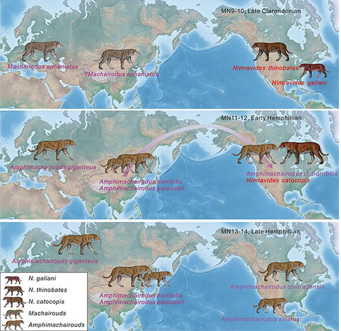 Nimravides catocopis出现于北美海费里1期,大约900万年前,而东亚和北美晚中新世的生物大规模交流发现于海费里2期,从750万年开始持续到中新世末,而海费里1期目前没有任何大哺乳动物交流的记录。这也支持北美的匕齿猎剑虎