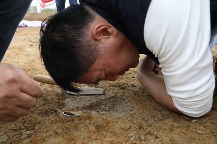 浙江省考古所研究员徐新民正在细细观察脚印遗迹。 共享联盟·湖州 吴建勋 摄