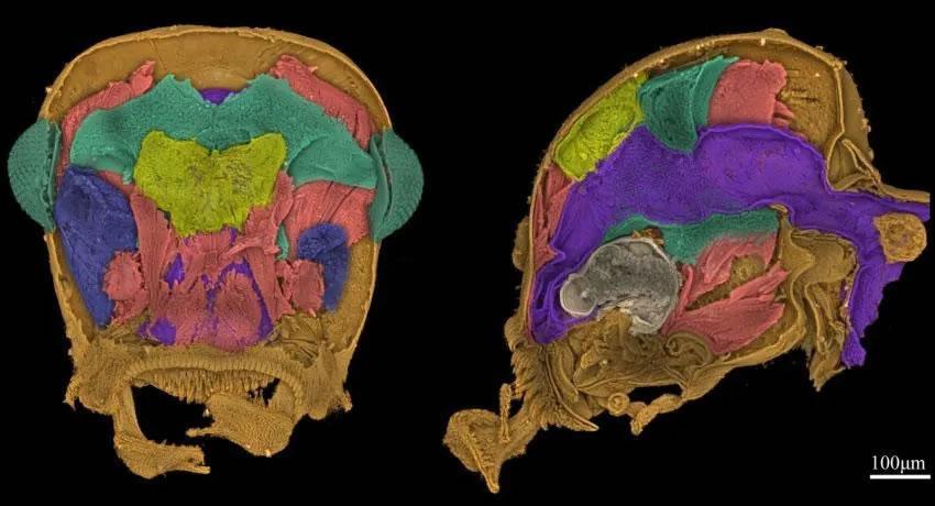 许雯婧说,“我们的扫描精度非常高,结果非常好。尽管这只古蚂蚁的头部只有不到1毫米宽,我们却获得了包括近乎完整脑在内的丰富头部信息,其中的肌肉和腺体也非常完整。”