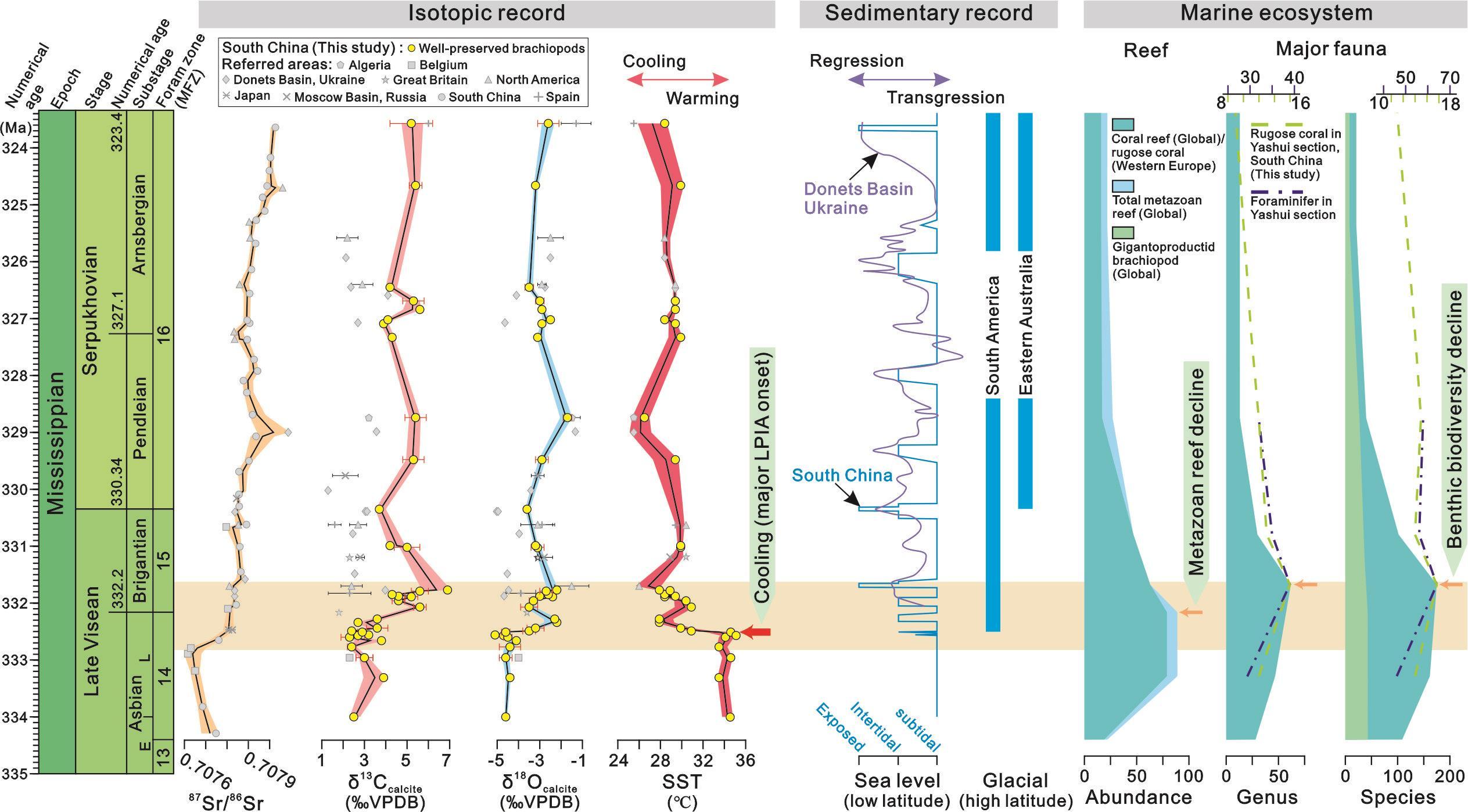 研究发现在密西西比亚纪维宪晚期(Asbian-Brigantian之交)腕足类壳体氧同位素存在一次显著正偏,幅度约2‰,其指示该时期古海水温度降低约5℃。维宪晚期这次显著气候变冷事件与高纬度冈瓦纳大陆冰川发育、低纬度海平面降低和高频率旋回地层发育等相一致,它们共同指示这次全球气候变冷可能代表了晚古生代大冰期主幕的开始。同时,这次变冷事件伴随珊瑚礁丰度和底栖生物多样性的明显减少;随着谢尔普霍夫期气候的持续变冷,珊瑚礁丰度逐渐降低,于谢尔普霍夫晚期达到最低值。