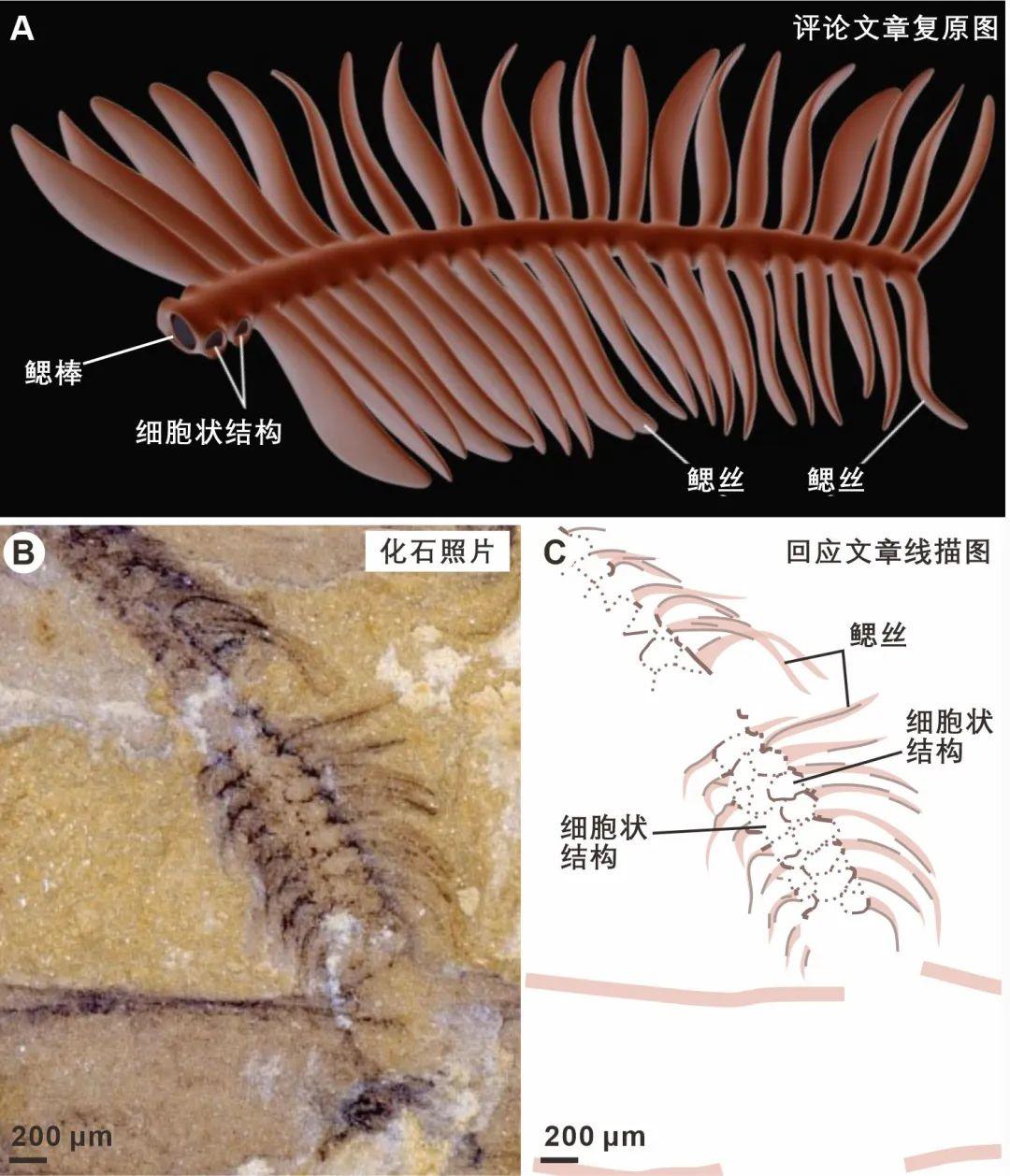(A)He等评述文章中的鳃弓复原图认为鳃棒呈中空管状,(B–C)原作者团队根据He等提供的化石照片;(B)重新解释了鳃棒内部并非中空,而是由多排2–3个细胞状结构组成(C);(A–B)来自(He et al., 2023),(C)来自(Tian et al., 2023)。