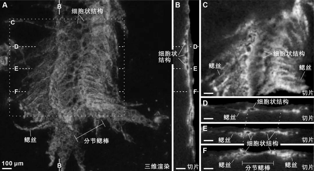 (A)鳃棒内部并不是中空管状,而是由多排细胞状结构组成;(B–F)三个方向的切片都显示细胞状结构是密闭空心的,与鳃丝并不相通,不是鳃丝根部底座; 比例尺均为100 μm。修改自(Tian et al., 2023)。