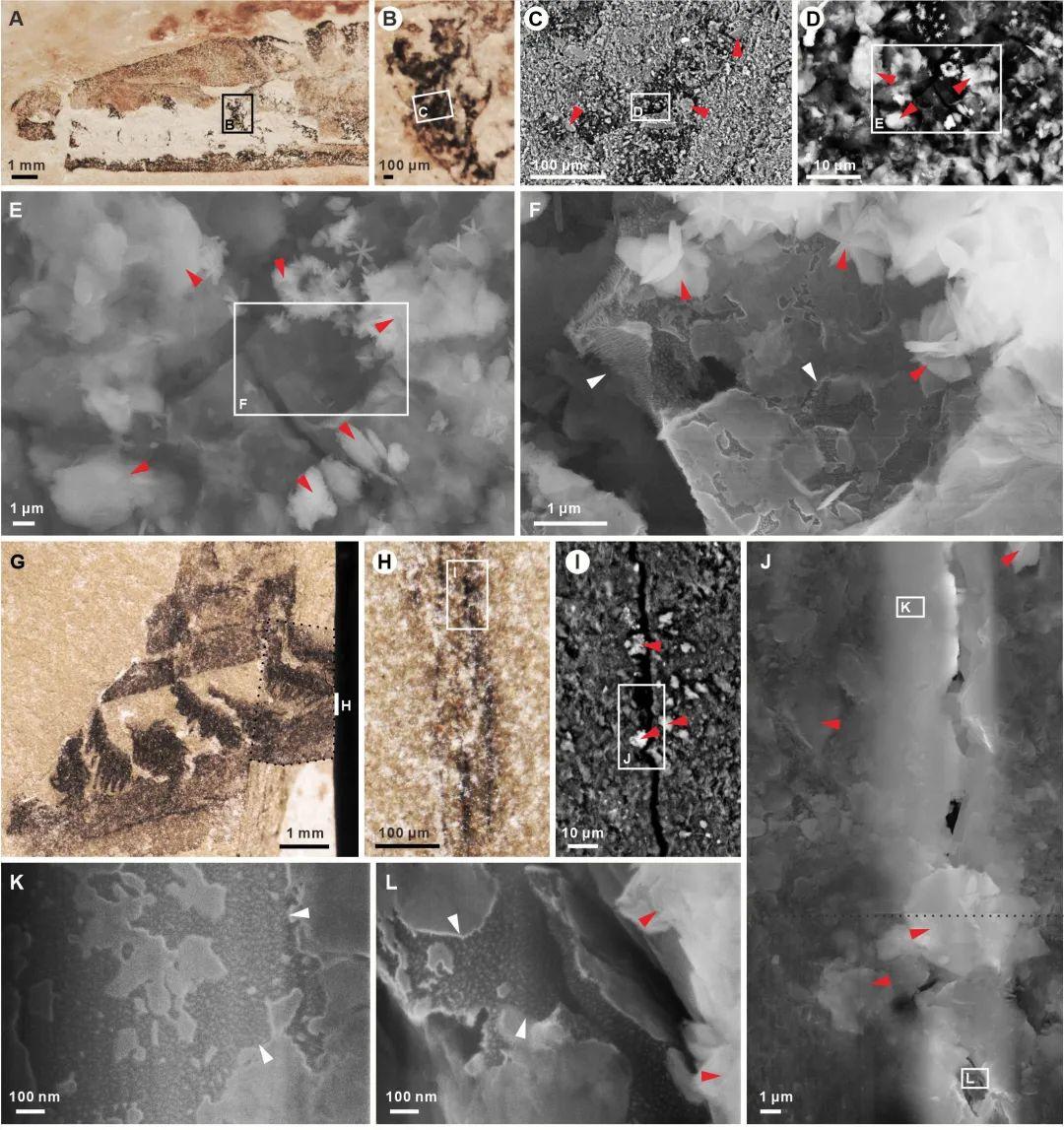 (A–F)在化石表面,碳膜上有沉积物颗粒覆盖;(G–L)在化石截面上,碳膜被紧紧地夹在两层沉积物之间; 红色三角形指示沉积物颗粒,白色三角形指示微原纤维构造。来自(Tian et al., 2023)。