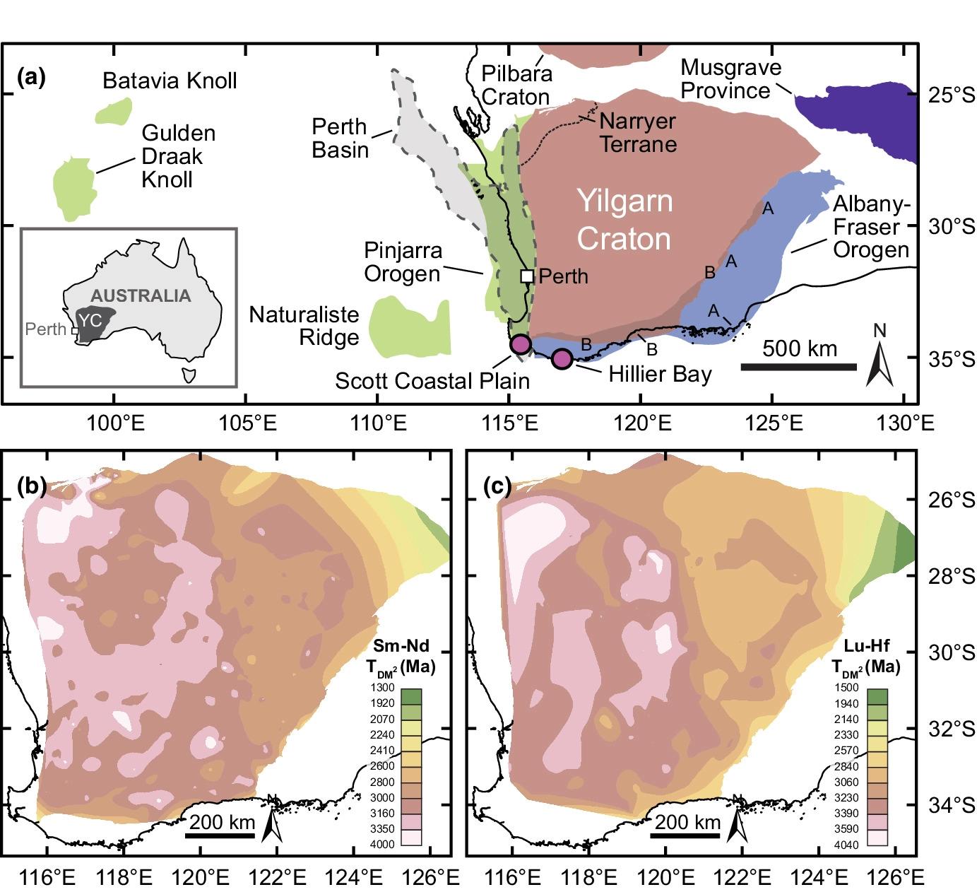 本工作中讨论的地壳单元的当前位置,插图显示了澳大利亚境内Yilgarn克拉通(YC)的地理范围