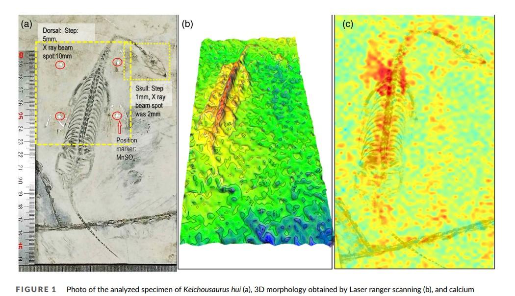 A为化石标本,B为化石的3D形状模型(红色-黄色等突出部分为凸起的骨骼),C为经形态校正的化石表面的钙元素分布(如躯体和颈部之间的大片区域的钙含量比周围高)