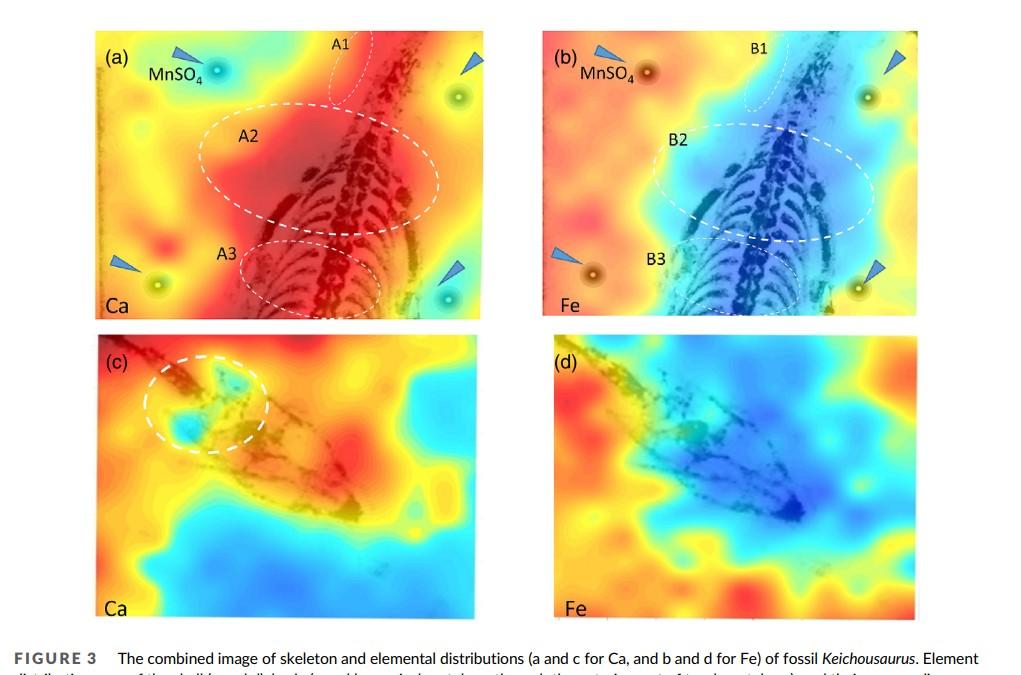 课题组利用此设备对一块贵州龙化石表面的钙和铁元素的分布规律进行了初步研究,发现:1)贵州龙前胸部相比较腹部,钙元素分布面积更广,指示其前胸部软体可能更加膨大;2)该贵州龙腐烂降解过程中,其内脏或腐烂产物更有可能从前胸溃烂口以及口腔处形成的通道流出;3)化石标本头部颞窝及附近位置出现元素分布异常,推测该位置可能存在人为修补的可能。
