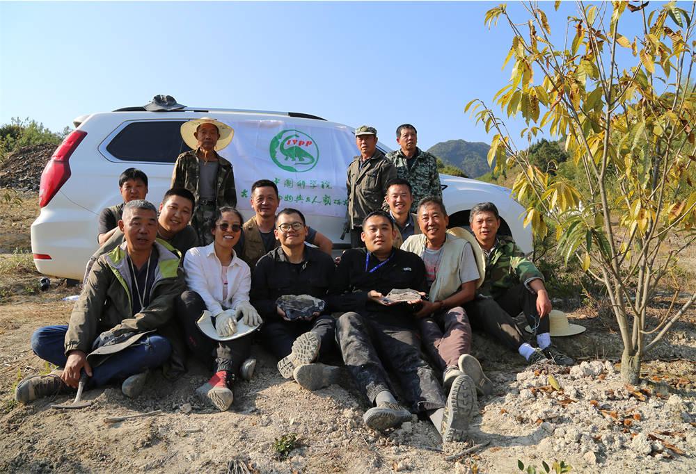 图1: 古脊椎所和福建地调院联合考察队发现奇异福建龙正型标本(前排左起:李岩、冯久桐、董丽萍、王敏、苗嵩、冯文清;中排左起、李宝贵、林虓、汤建荣、王林昌;后排:黄代和、黄代栋、陈官明)