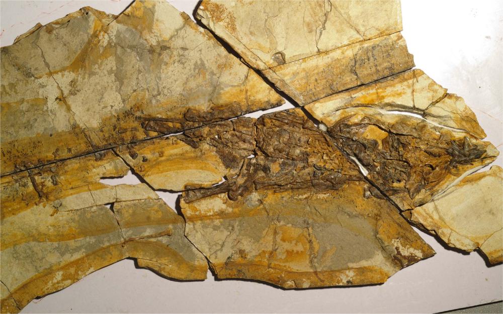 据了解,2017年,化石保护相关工作人员在巡查过程中,发现了部分裸露的恐龙化石骨骼,为避免次生破坏,经自然资源部批准,进行了抢救性挖掘修复。记者在丰宁化石保护研究中心看到,长约5米的剑龙类恐龙化石保存近乎完整,尾部有四根骨刺,辨识度极高。其骨骼化石四周散布着大面积完整的皮肤化石,似鳞片状排列的纹路十分清晰。