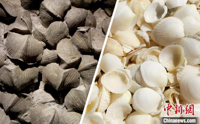 腕足类化石(左)与双壳类贝壳(右)。陈中强供图