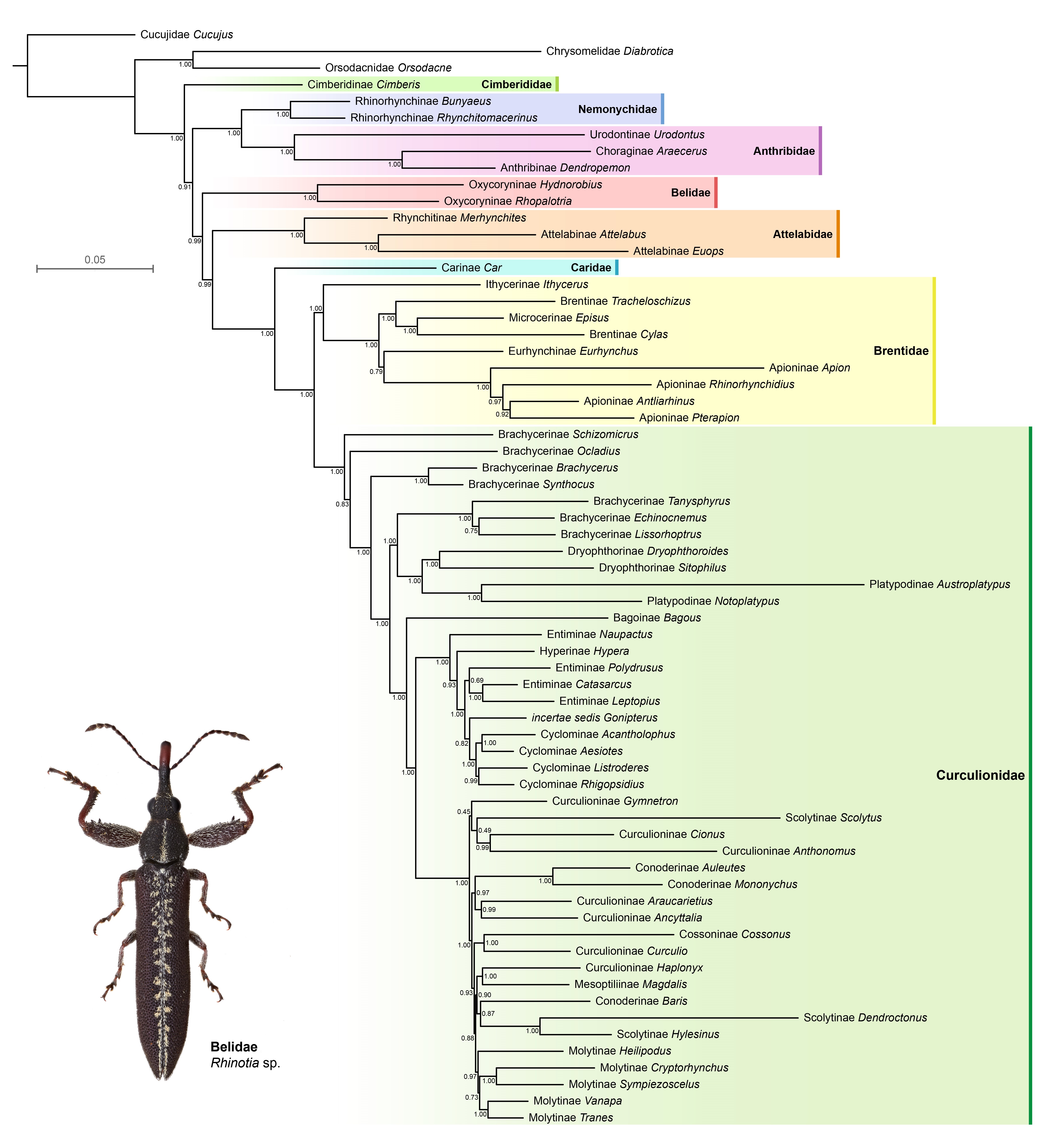 象甲总科是一类非常繁盛的昆虫,已描述超过6万个物种,是当今自然界物种多样性最高的类群之一。近日,中国科学院南京地质古生物研究所研究员蔡晨阳等人,通过对前人发表的象甲总科数据集进行重新系统发育分析,构建了可靠的象甲总科各科间的系统发生骨架树,解决了现生象甲总科各个科之间的演化关系,相关成果于9月20日发表于国际期刊《生物学快报》(Biology Letters)。