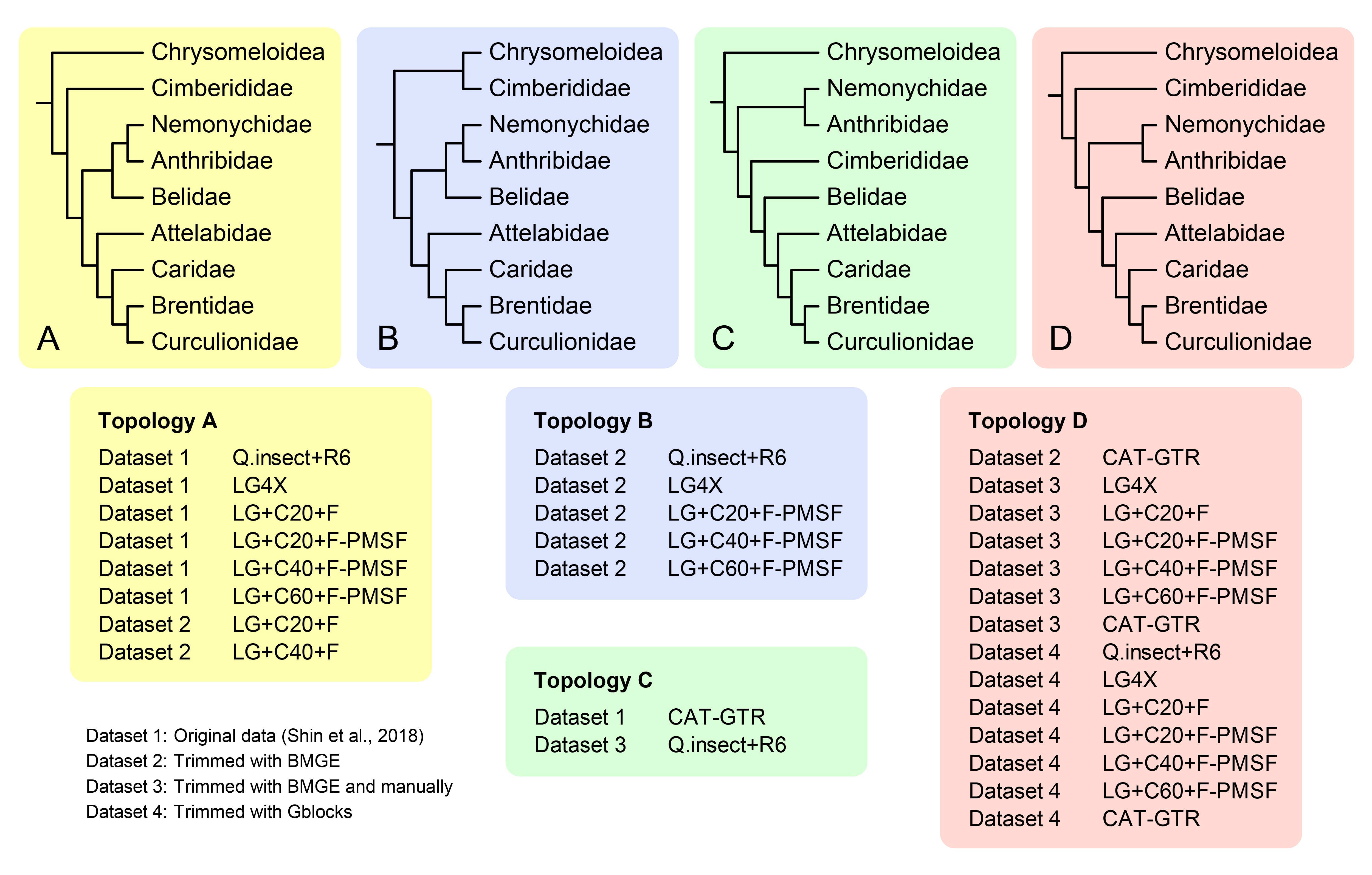 △不同进化模型和数据集生成的拓扑结构比较(拓扑结构D代表可靠的象甲总科内部演化关系)