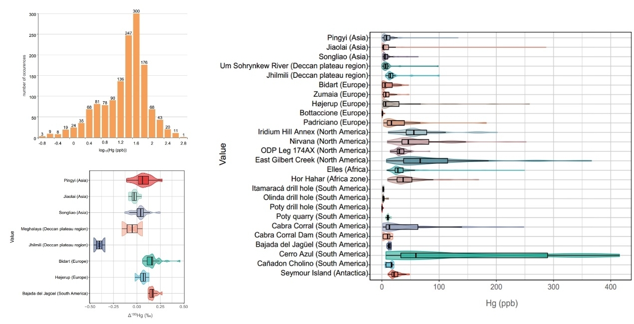 近日,中国科学院南京地质古生物研究所副研究员李莎带领研究团队与中国地质大学(北京)教授万晓樵等合作,对白垩纪/古近纪(K/Pg)界线附近的海相和陆相地层中的汞记录进行了综合对比。研究人员整合了分布于全球各地26个关键剖面和钻孔资料,发现德干玄武岩喷发导致K/Pg界线之前或界线处的汞值呈对数正态分布,与显生宙其他大灭绝事件界线处的汞数据具有相似的趋势。相关研究成果发布在地球科学综合性期刊《地球科学评论》(Earth-Science Reviews)。