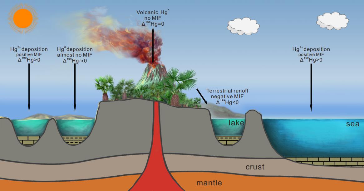 由于汞同位素可以为追踪汞源提供有效信息,研究人员在胶莱盆地(中国)、松辽盆地(中国)、Meghalaya(德干高原地区)、StevnsKlint(丹麦)和Bottaccione(意大利)剖面和钻孔中,发现奇数汞同位素的非质量分馏信号(Hg-MIF)接近于0,认为其与火山活动从地幔带来的汞有关;在平邑盆地(中国)、Bidart(法国)、Padriciano(意大利)和Bajada del Jagüel(阿根廷)的剖面和钻孔中,Hg-MIF偏正,主要代表二价汞沉积,与二价汞的光致还原过程有关;而在Jhilmili(德干高原地区)剖面,Hg-MIF偏负,推测与陆源输入有关。