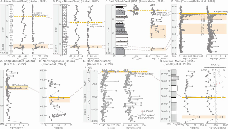 研究结果发现,全球分布的剖面/钻孔的汞记录与徳干火山活动的前两幕相对应:包括第一幕德干玄武岩喷发事件,时间约为66.3至66.15Ma;第二幕德干玄武岩喷发事件,时间约为66.1至66.0 Ma。其中,白垩纪末期变暖事件(LMWE)与第一幕德干玄武岩喷发事件相关,变暖事件对气候变化和生物危机具有全球影响,例如K/Pg界线之前海洋有孔虫的部分灭绝。然而,德干火山活动第三幕(约65.9至65.8Ma)和第四幕(约65.6至65.5 Ma)的汞记录尚未发现。