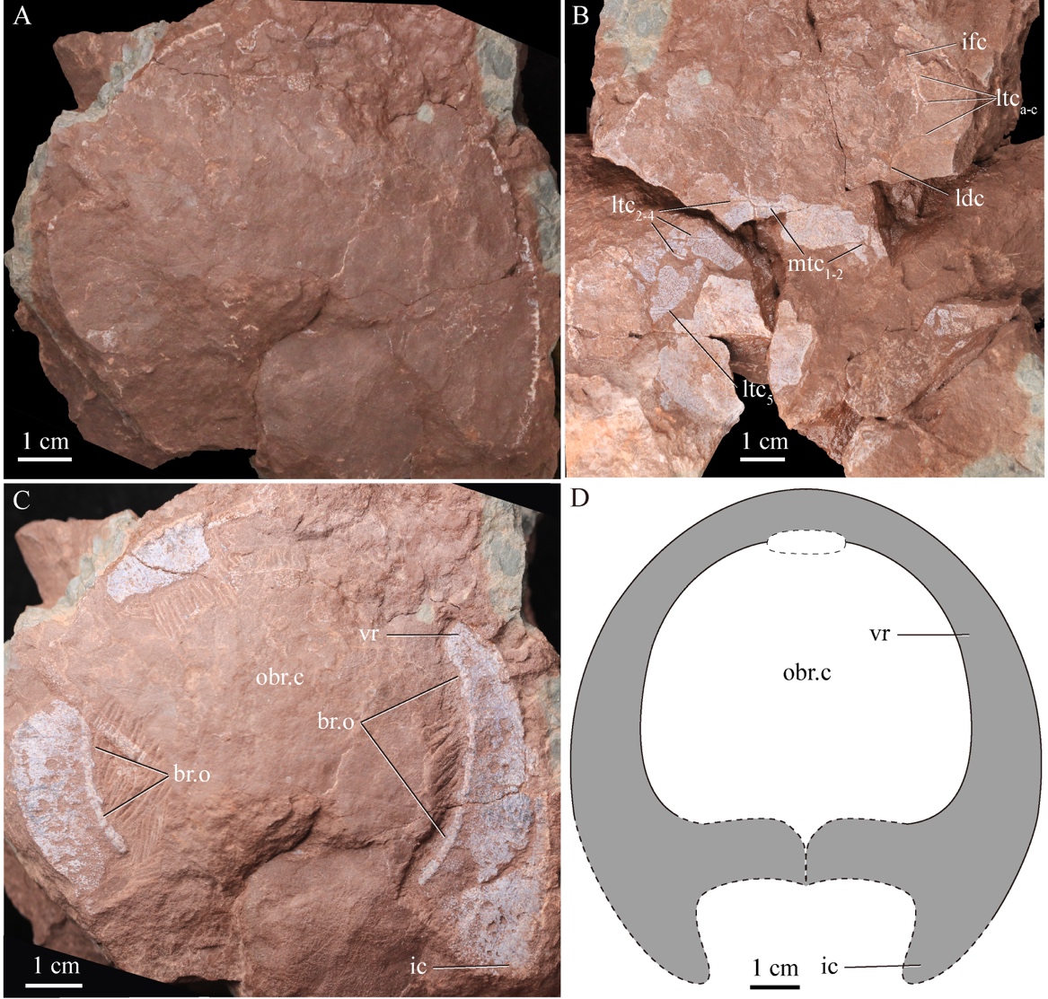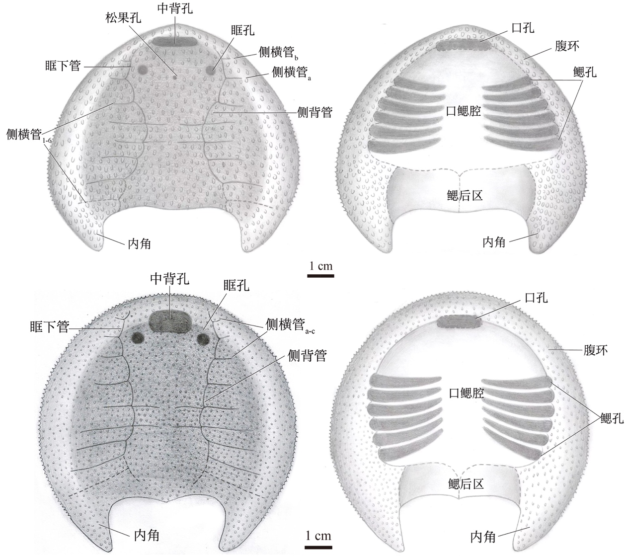 2021~2023年, 在国家自然科学基金的支持下,盖志琨研究员带领团队,先后多次赴新疆塔里木盆地进行野外调查,特别是在疫情期间,更是克服重重困难,完成了三次大规模的野外挖掘,最终取得了突破性进展,在塔里木盆地的柯坪县大湾沟和克尔买提村剖面的塔塔埃尔塔格组采获大量完整的盔甲鱼类化石。此次研究团队报道了在新疆柯坪县克尔买提的塔塔埃尔塔格组发现的张氏西域鱼新材料,新材料不仅再一次证实张氏西域鱼头甲为椭圆形,更重要的是,新材料完整保存了张氏西域鱼的腹环,补充了该种的头甲腹面特征,让我们对该种的形态学信息有了更加全面地了解(图2)。研究发现,张氏西域鱼的腹环前部宽度变化不大,仅在头甲后侧方才明显变宽并构成角的基部。腹环中央包裹着口鳃窗,口鳃窗几乎呈圆形。