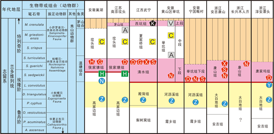 ↑图3 华南志留系兰多维列统常见门类(如几丁虫、笔石、腕足类、三叶虫、鱼类等)生物地层序列