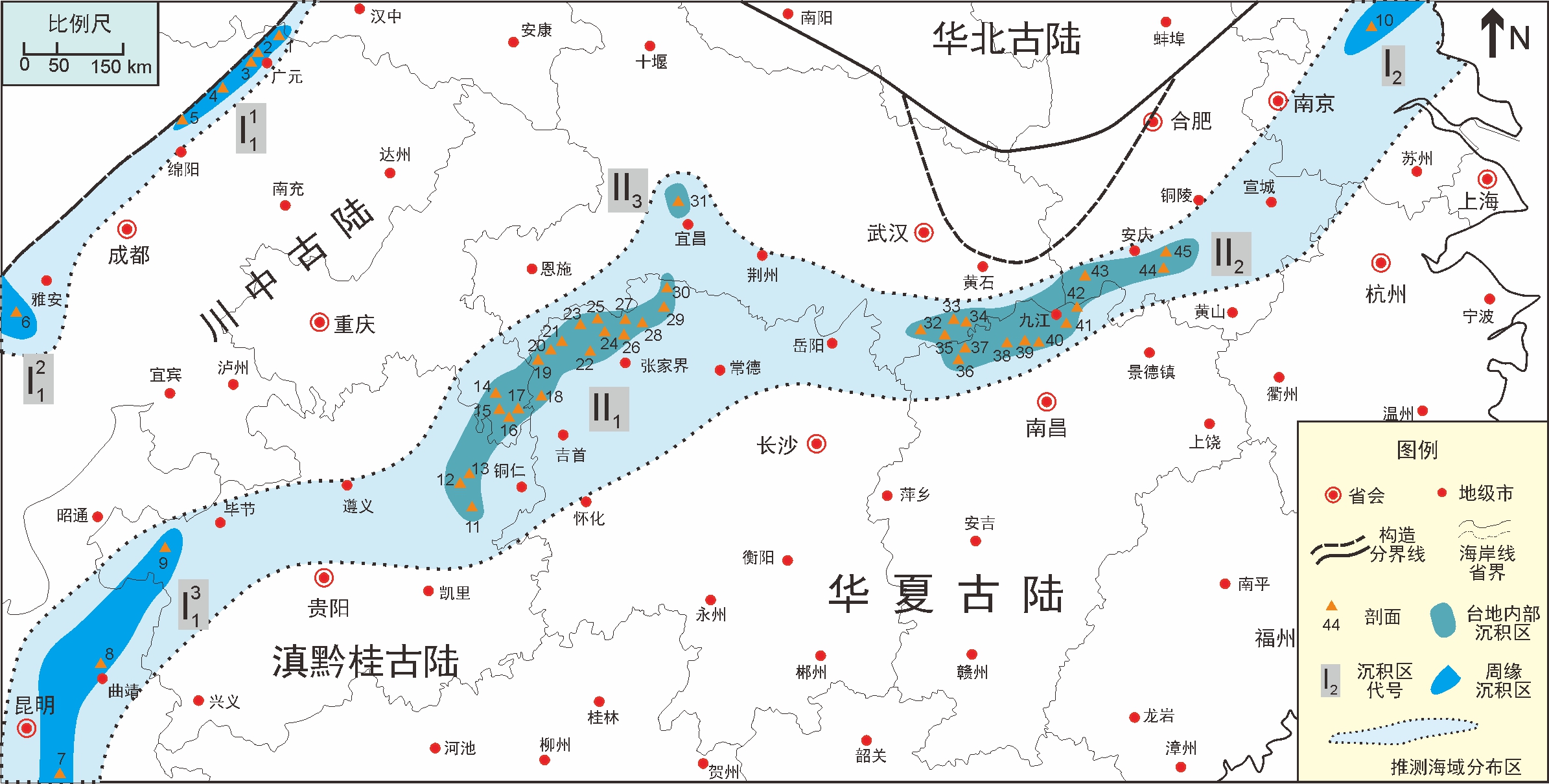 ↑图1 浙皖苏地区志留系兰多维列统唐家坞组、康山组、举坑组及侯家塘组(含海相红层)的分布图