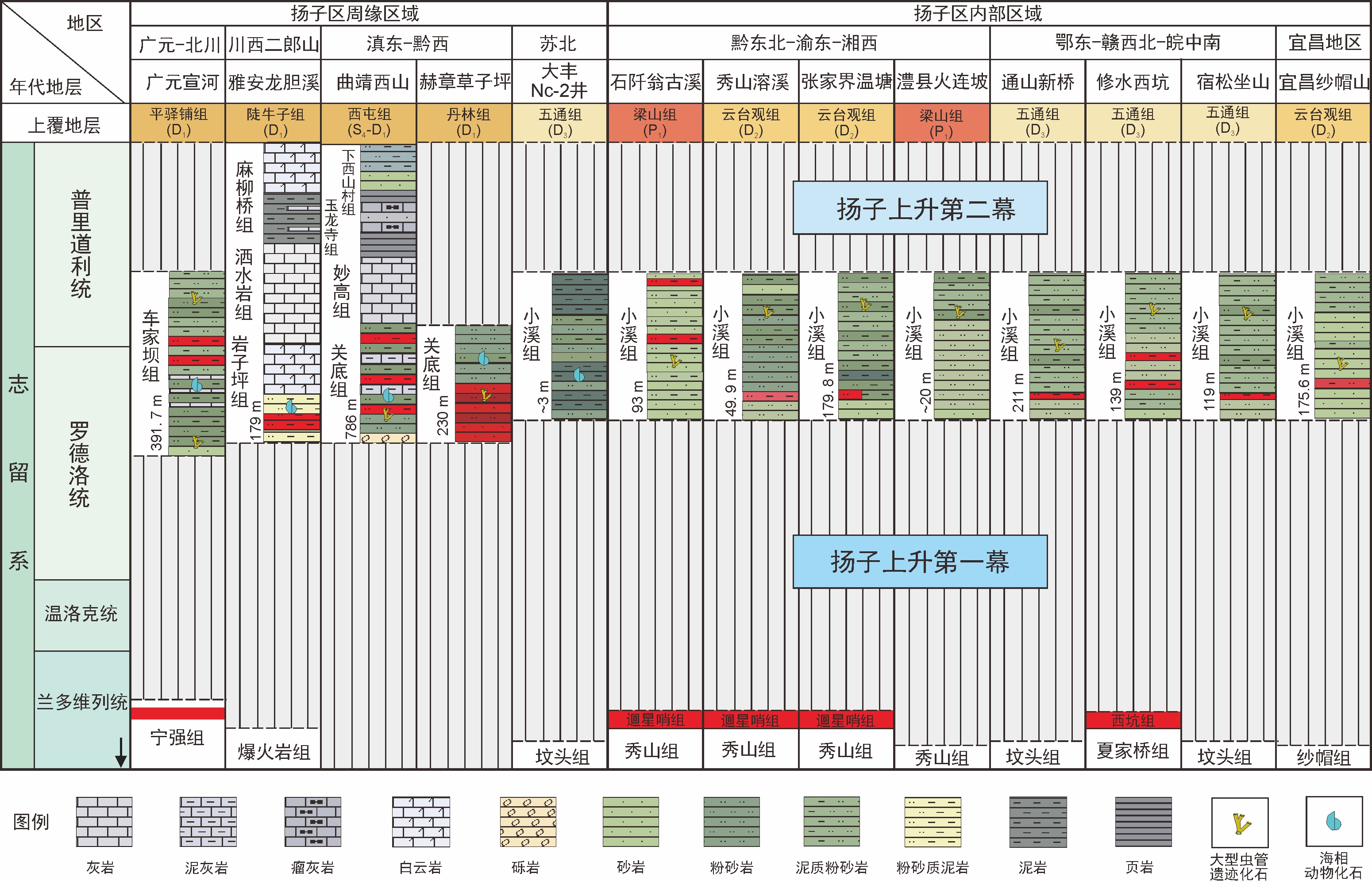 ↑图5 扬子区志留纪晚期地层(Ludlow晚期—Pridoli早期)划分和对比