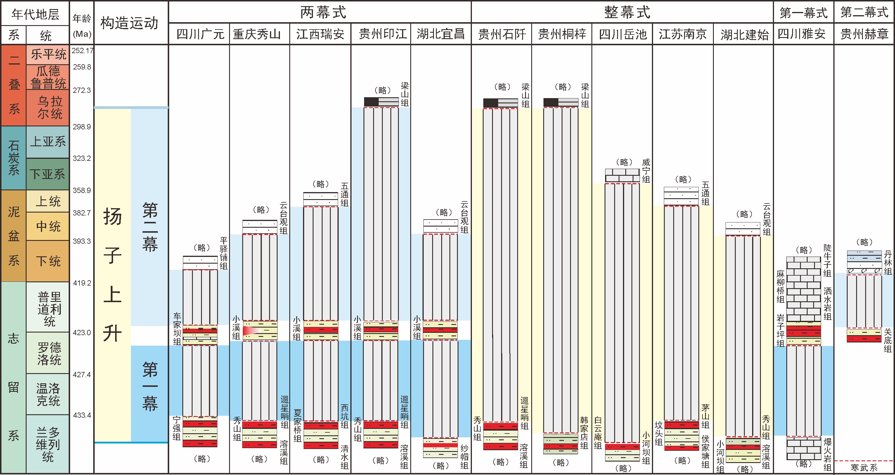 随着全球学者追寻“共同语言”,研究趋向精时化过程,国内开展重点攻关研究(如聚焦Telychian阶),加强与国际接轨。半个世纪以来,扬子区志留系研究浮现出一些亟待解决的问题,其中包括:(1) 扬子多数地区志留系顶界位置不断下压(如纱帽组和韩家店组划归Llandovery统),但苏浙皖志留系划分对比却一直是老大难问题;(2) 扬子区(如宜昌、秀山、石阡、张家界)志留系顶部不断发现Ludlow—Pridoli世地层,但区内时空分布和地质意义有待深入研究。这两个重点对华南地质演变、特别是理解“广西运动”对华南的影响至关重要。在“中国志留系研究”百年之际,我们完成了这两篇有关志留纪地层对比的论文,以表纪念。