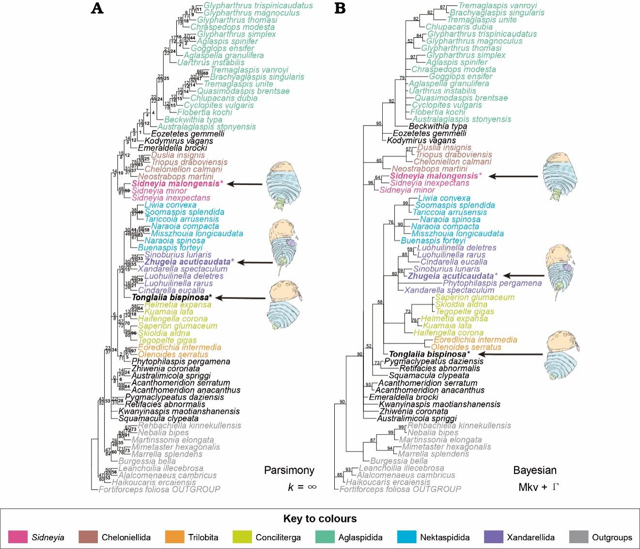 为解析以上新属种的演化位置,研究人员对样品进行形态编码,并采用简约法和贝叶斯法进行类肢类系统树的重建(图2)。结果表明诸葛虫与海怪虫类中的中华疑虫(Sinoburius)构成姐妹群;铜濑虫与融背虫和观音虫(Kwanyinaspis)亲缘关系较近,但不属于目前已知的三叶形虫类群;西德尼虫属内部的亲缘关系则有待进一步解析。