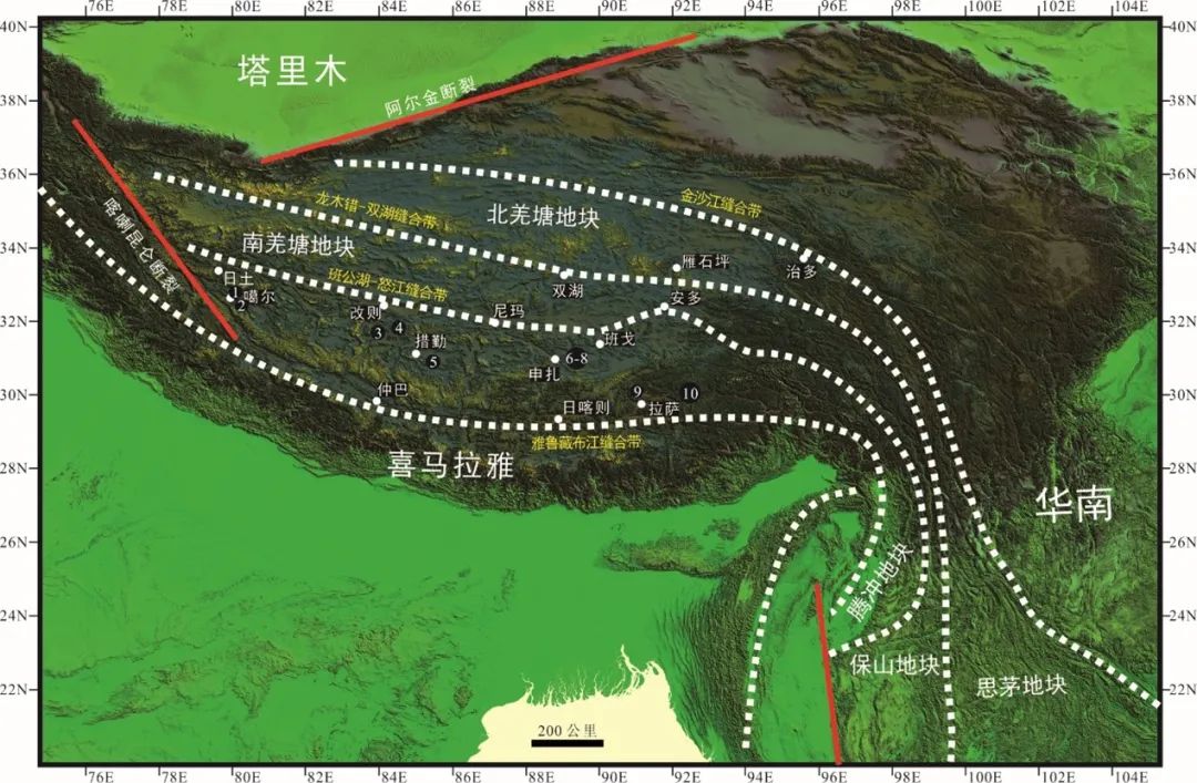 青藏高原是由一系列地块经历复杂的板块运动拼接而成,因此它的形成记录了异常复杂的特提斯洋演化过程。拉萨地块是青藏高原上一个重要的地块,它北侧以班公湖-怒江缝合带为界与南羌塘地块相邻,南侧以雅鲁藏布江缝合带为界与特提斯喜马拉雅带相邻(图1)。而两个缝合带所代表的班公湖-怒江洋(中特提斯洋)和新特提斯洋的早期演化是近些年学术界高度关注的重大科学问题。