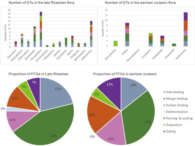 ↑ 四川盆地晚三叠世和早侏罗世各类群植物的昆虫伤害类型多样性与所占比例