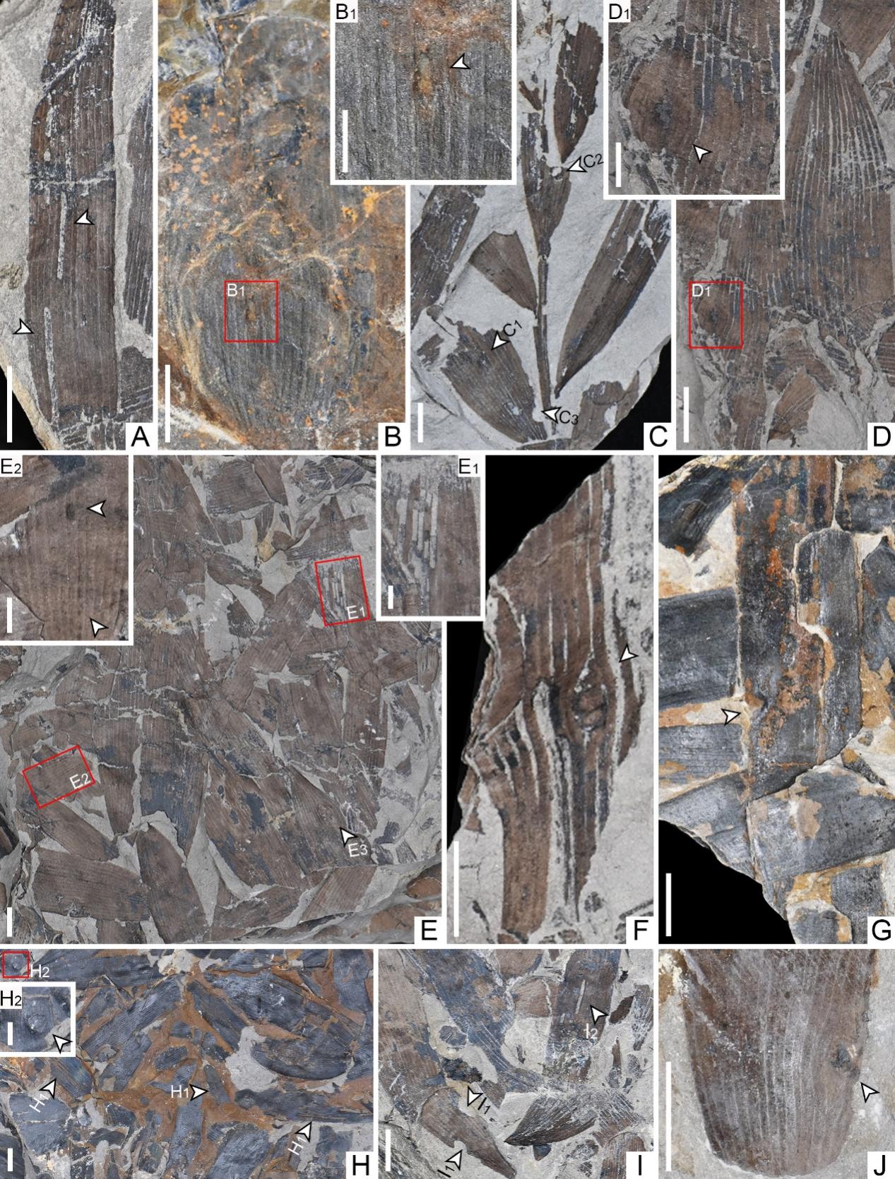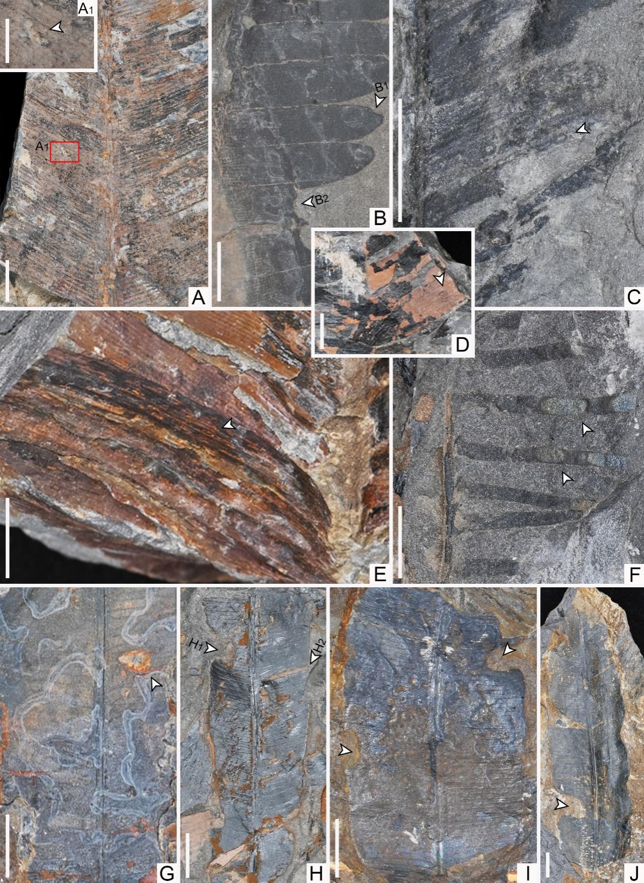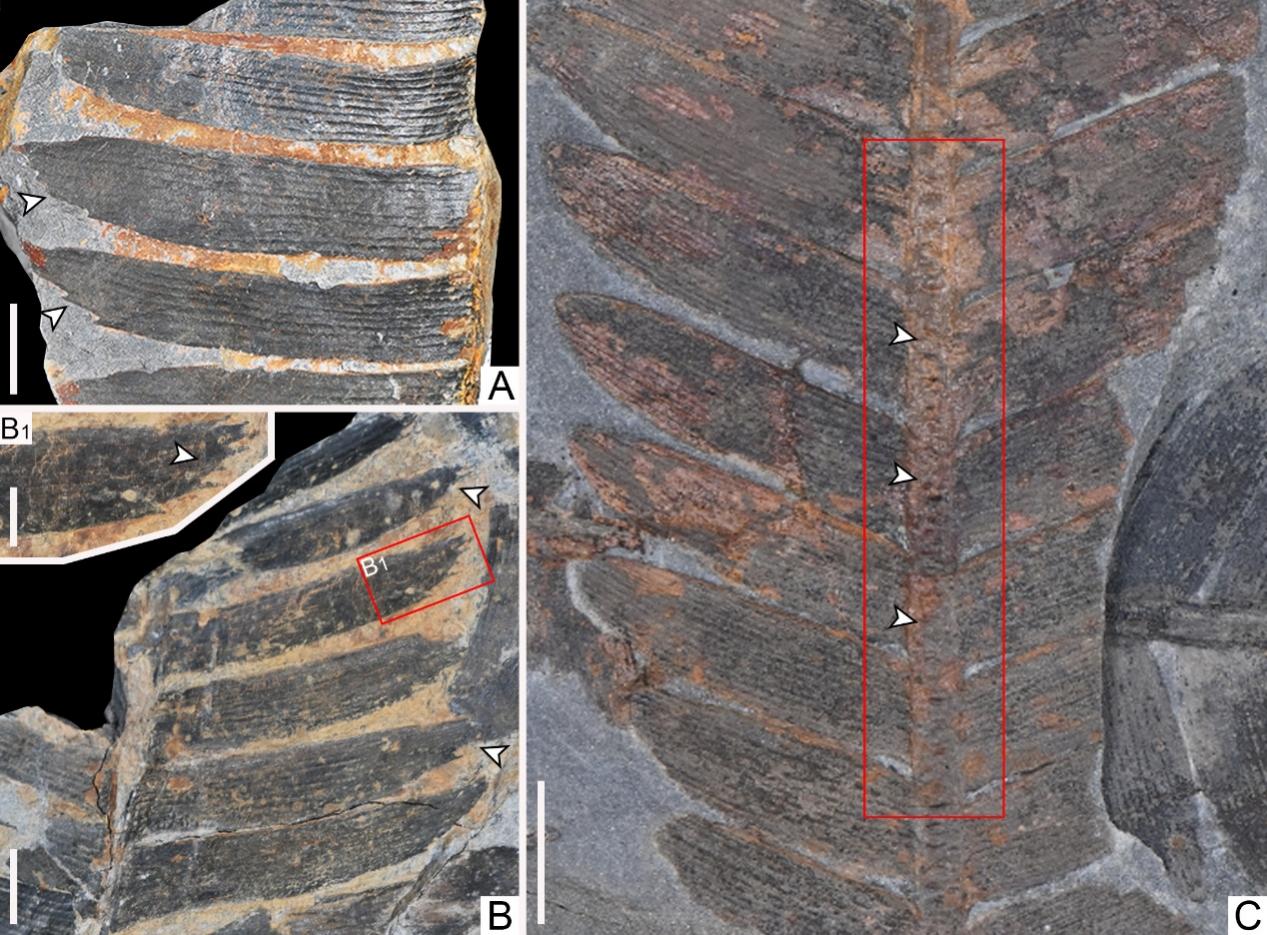 ↑ 部分植物化石叶片边缘的锯齿状特征(A-B)和叶片中轴显著的瘤状突起/增厚(C)
