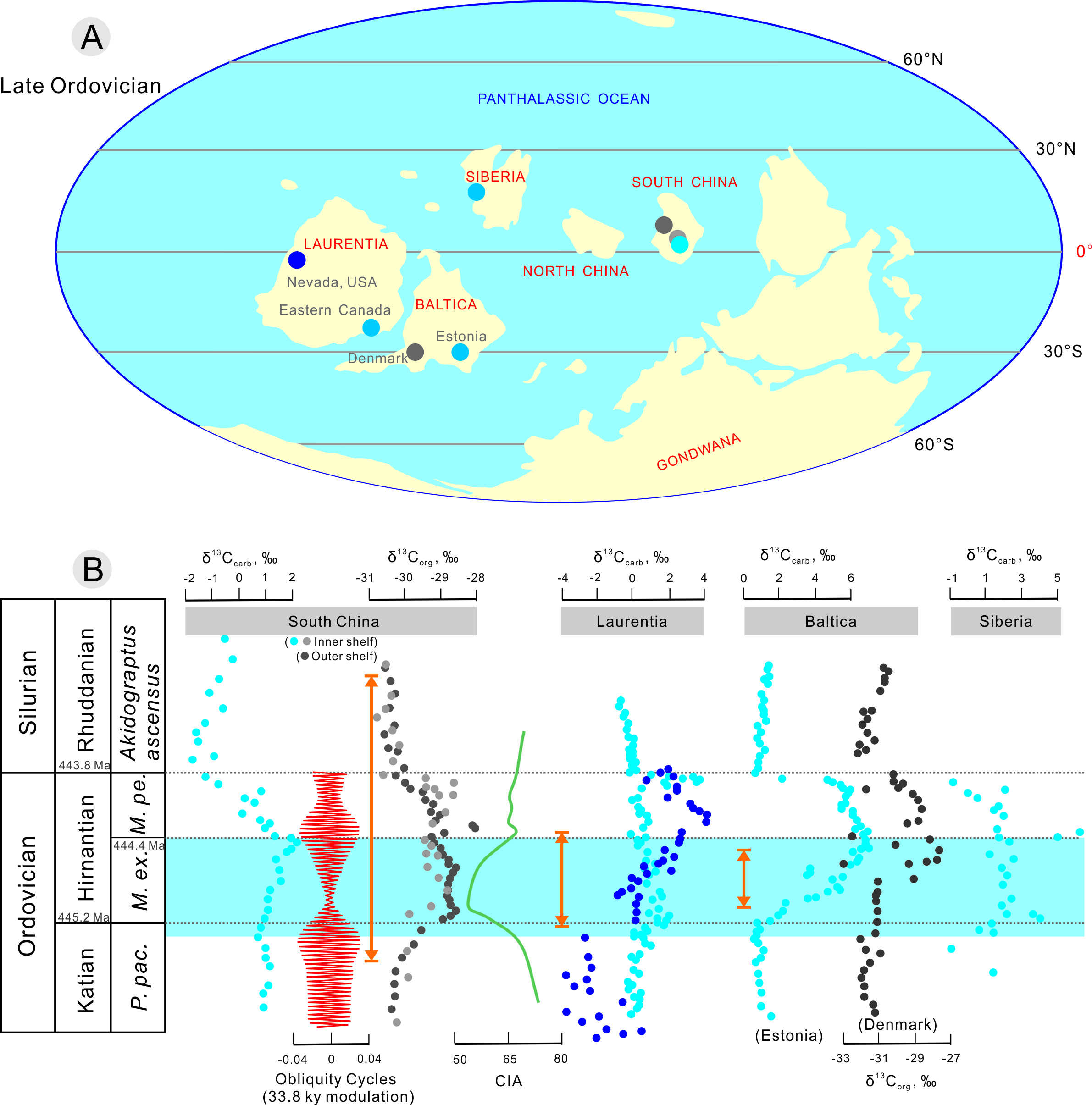 ↑ 全球古地理位置(图A)和综合地层对比(图B)