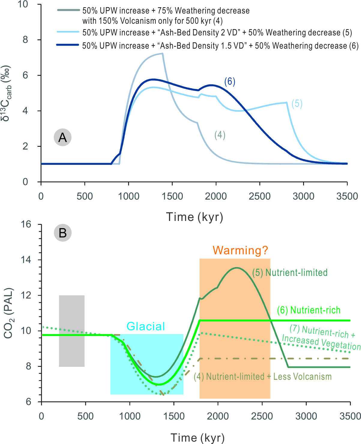 ↑ 模拟结果碳同位素曲线(A)和大气二氧化碳浓度变化(B)